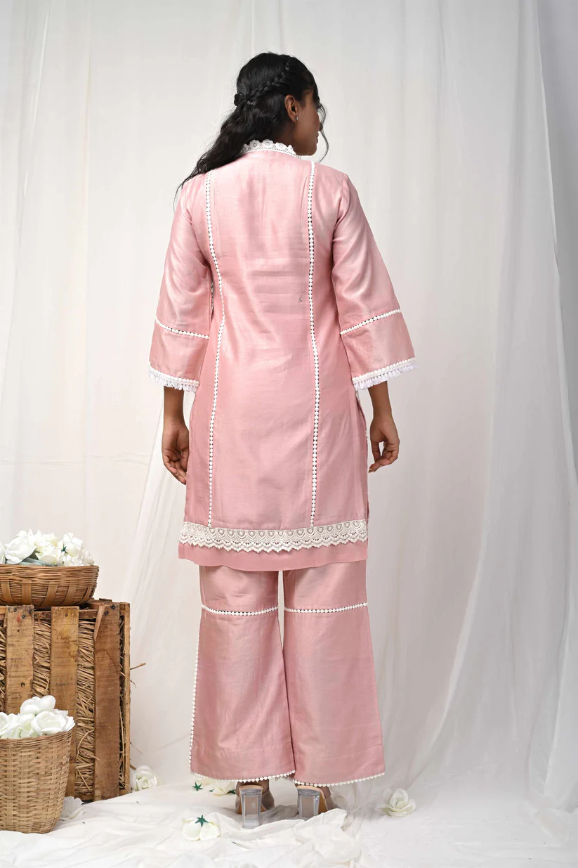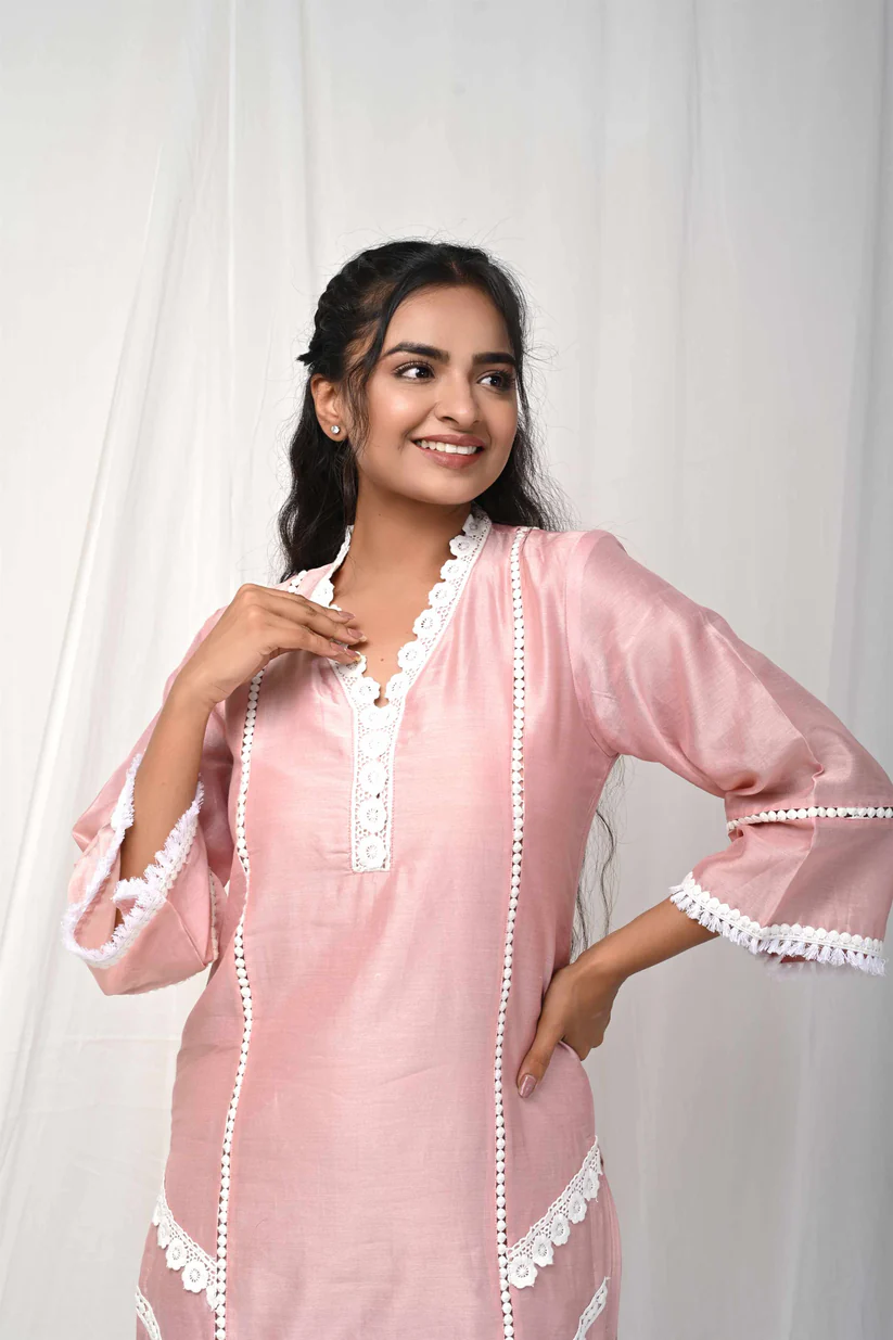 Crafted in fine Chanderi, the kurta carries a gentle sheen and an airy translucence that glows softly against the skin. Intricate white lace traces the neckline, sleeves, and hem, blooming like hand-embroidered florals across the silhouette. Vertical lace accents elongate the form, while sheer panels add depth and a whisper of romance.
