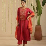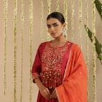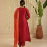Crafted in handloom Chanderi, the kurta and dupatta glow in a deep, festive red accented with warm, sun-touched embroidery that feels both rooted and celebratory. Intricate handwork on the yoke adds texture and movement, lending the ensemble a soulful, handcrafted appeal. The soft Chanderi fabric drapes fluidly, catching light with a gentle sheen that elevates it for festive gatherings and intimate celebrations alike.