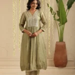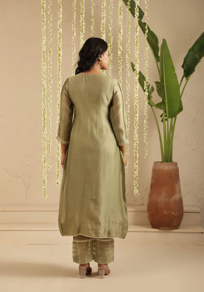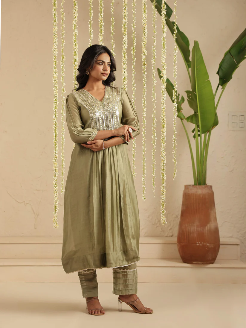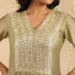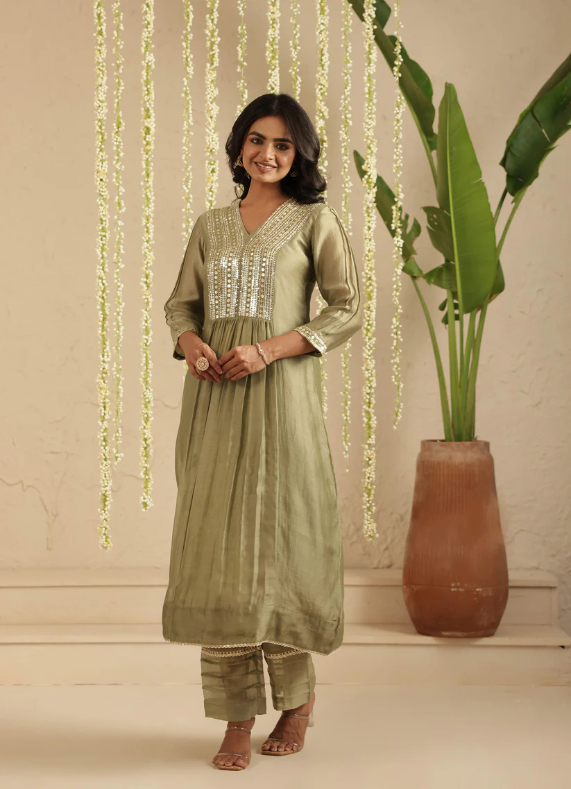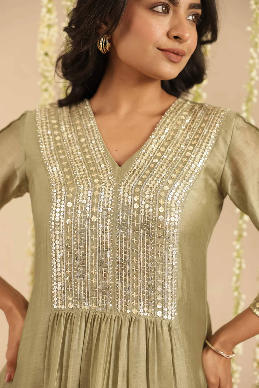 Rendered in a soothing olive-green hue, this kurta is crafted in handloom Chanderi that drapes fluidly while holding a gentle sheen. The V-neck yoke is adorned with fine, linear sequin embroidery—bold in detail yet refined in expression—creating a rhythmic play of light against the fabric. A gathered waist adds graceful movement, while the three-quarter sleeves and delicate borders keep the silhouette balanced and timeless.