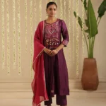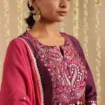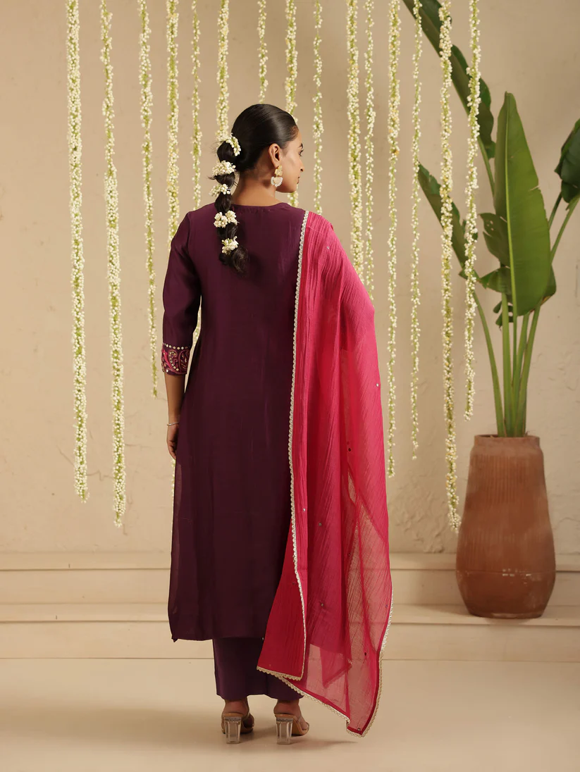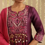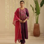 This striking ensemble blends rich colour with handcrafted detail, making it perfect for celebratory occasions. The handloom Chanderi kurta features an intricately embroidered yoke adorned with fine threadwork and delicate embellishments that create depth, texture, and a festive focal point. Subtle detailing on the sleeves complements the ornate front, while the fluid silhouette ensures effortless grace.