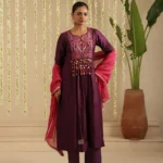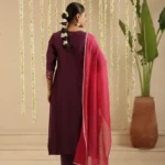 Paired with coordinated Chanderi pants, the set maintains a refined and balanced look. The ensemble is completed with a lightweight Chanderi dupatta, softly finished with delicate edging, adding movement and a graceful festive finish. The contrast tones enhance the overall richness while keeping the look elegant and wearable.