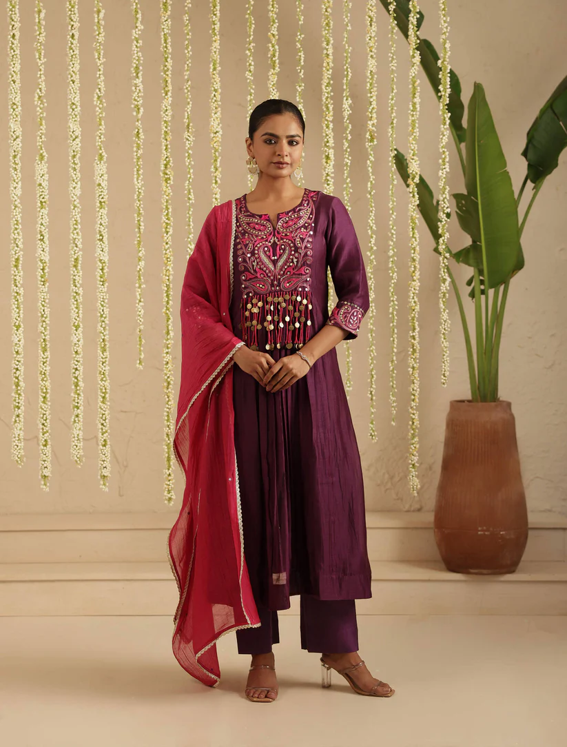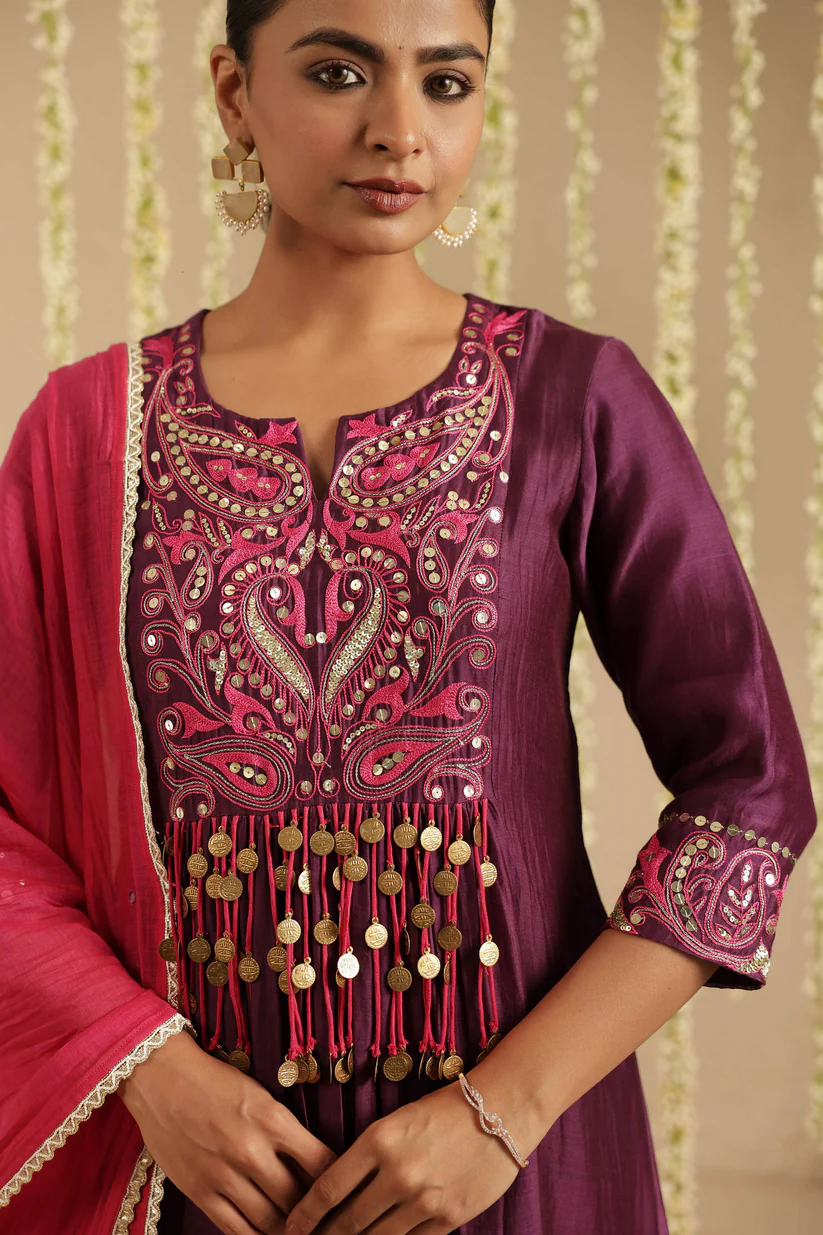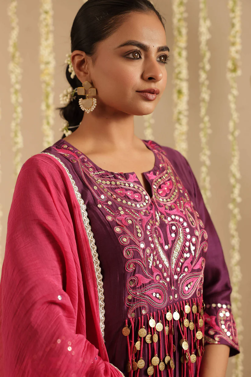 Gulabik Purple and Hot Pink Tassel Ethnic Suit Set for Women