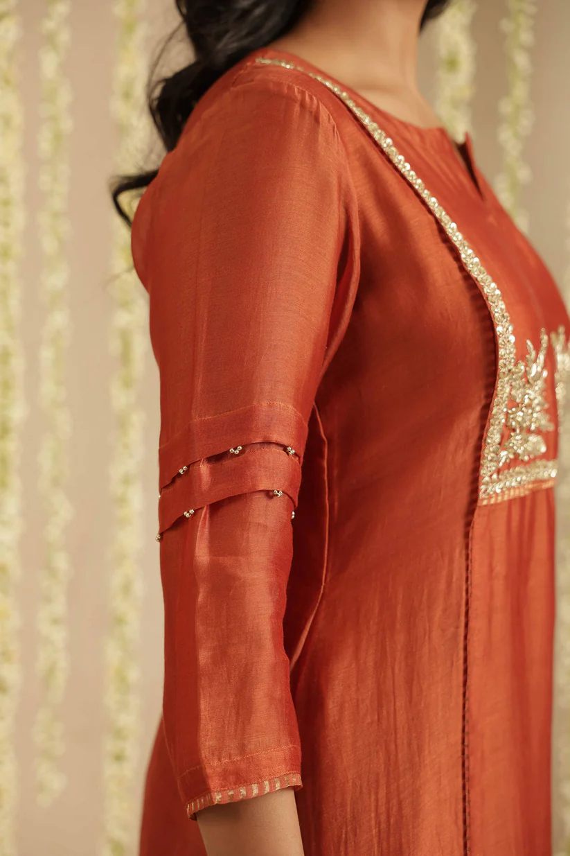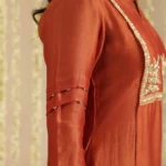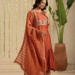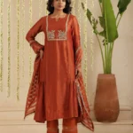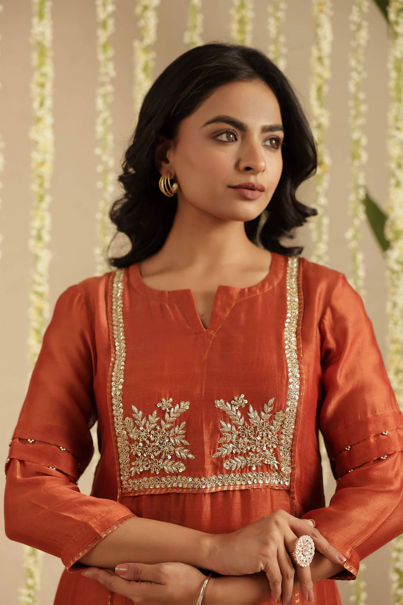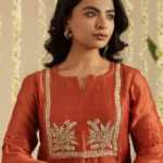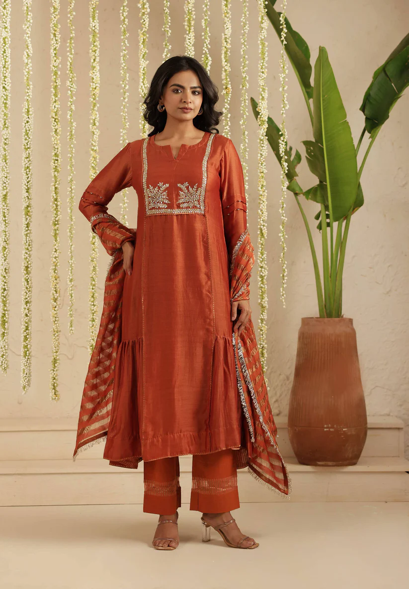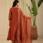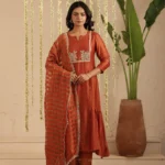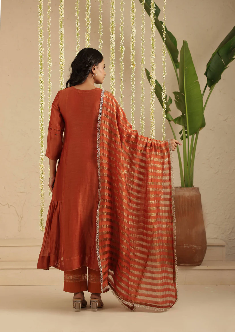 Paired with a comfortable cotton pant, the ensemble is completed with a Tissue Chanderi dupatta, detailed with classic stripes and finished with the season’s favourite Jhalar lace for a hint of shimmer and movement. The rich rust tone lends depth and versatility, making it ideal for both daytime festivities and intimate evening gatherings.