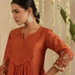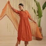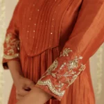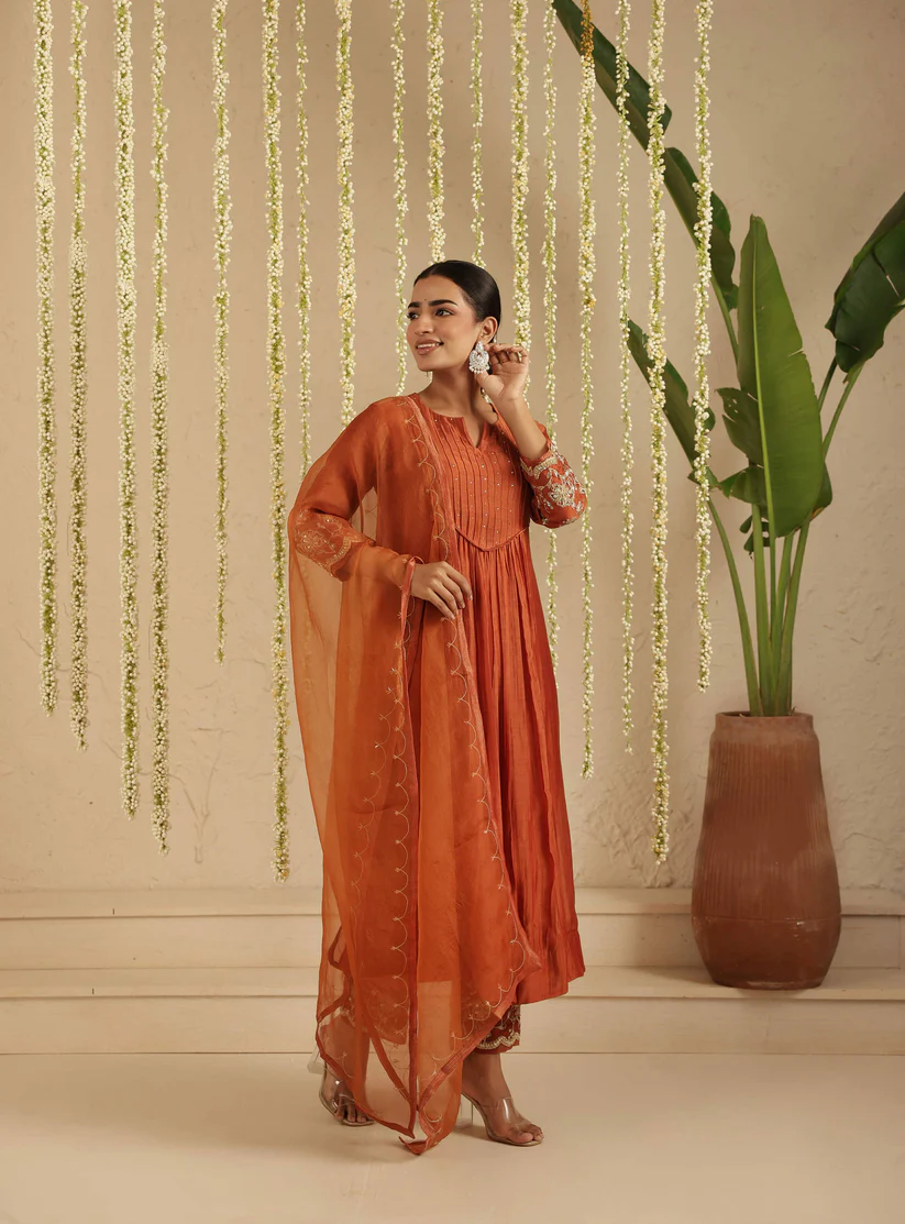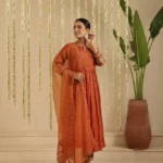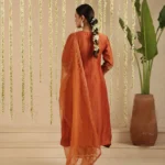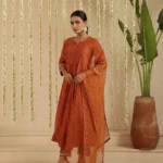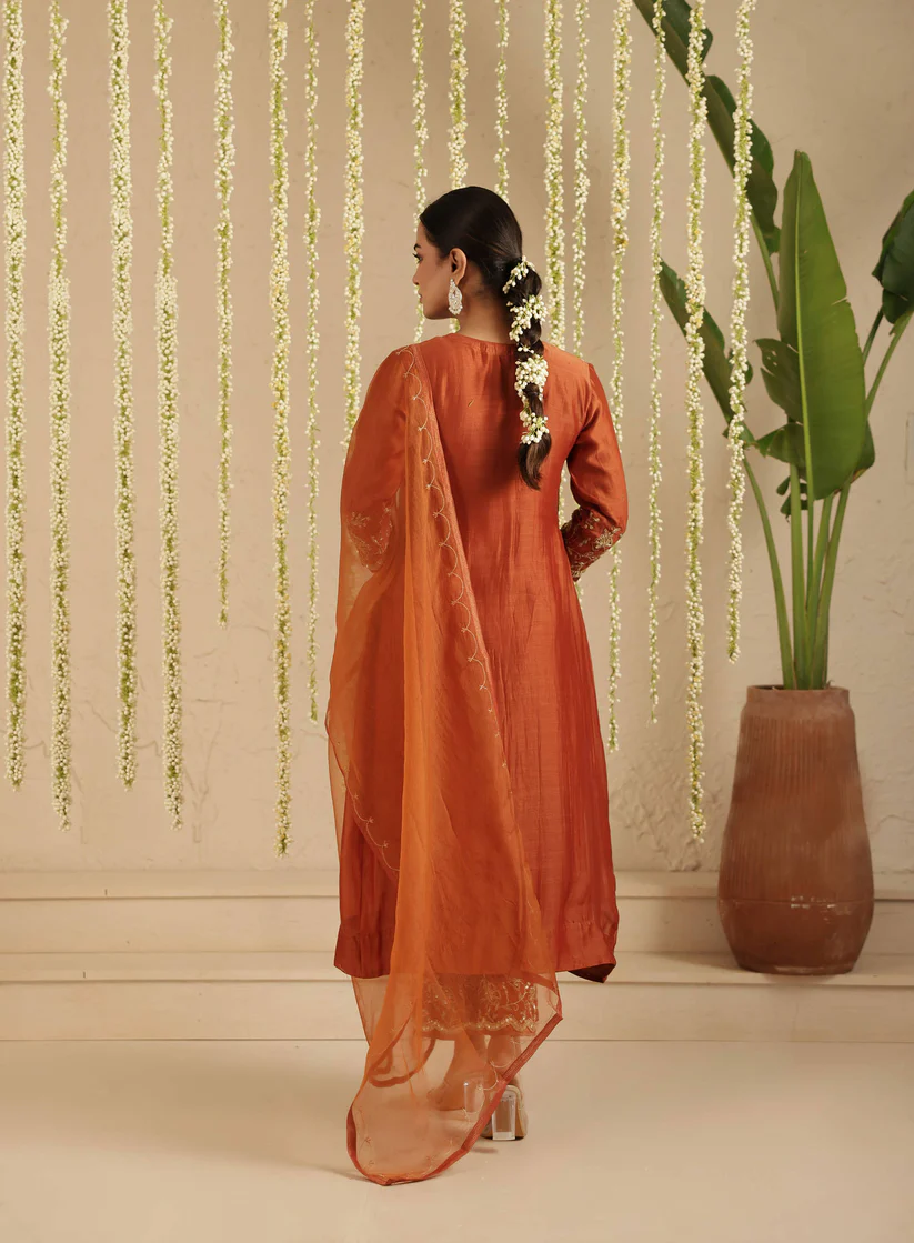Paired with matching Chanderi pants, the ensemble maintains a cohesive, elegant appeal, while the sheer Chanderi dupatta drapes lightly, finished with fine embroidered accents that lend a festive touch. The warm, earthy tone enhances the natural sheen of the fabric, making it perfect for day festivities, intimate gatherings, and cultural celebrations.
