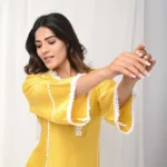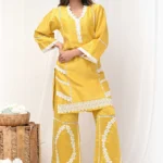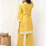 The matching pants mirror the kurta’s charm with ornate lace motifs, creating a harmonious balance of playfulness and refinement. Together, the set feels cheerful yet graceful—perfect for days that call for colour, comfort, and quiet celebration.
