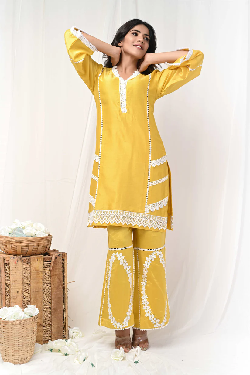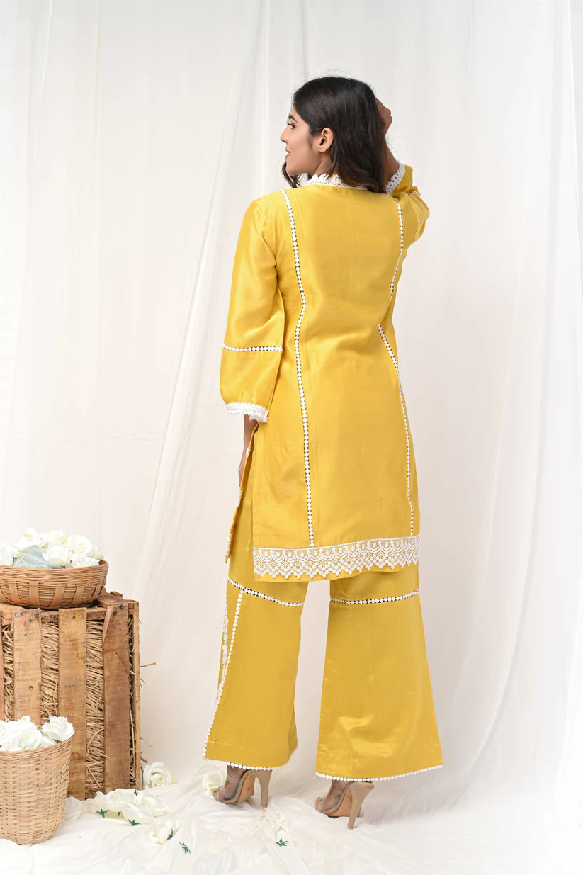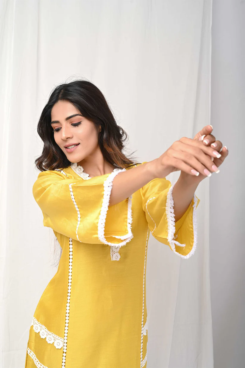 Crafted in fine Chanderi, the kurta glows with a soft, natural sheen that feels light yet festive. Delicate white lace traces the neckline, sleeves, and hem, standing out beautifully against the vibrant yellow base like petals against sunlight. Vertical lace accents add structure and elegance, while the relaxed silhouette keeps the look easy and fluid.