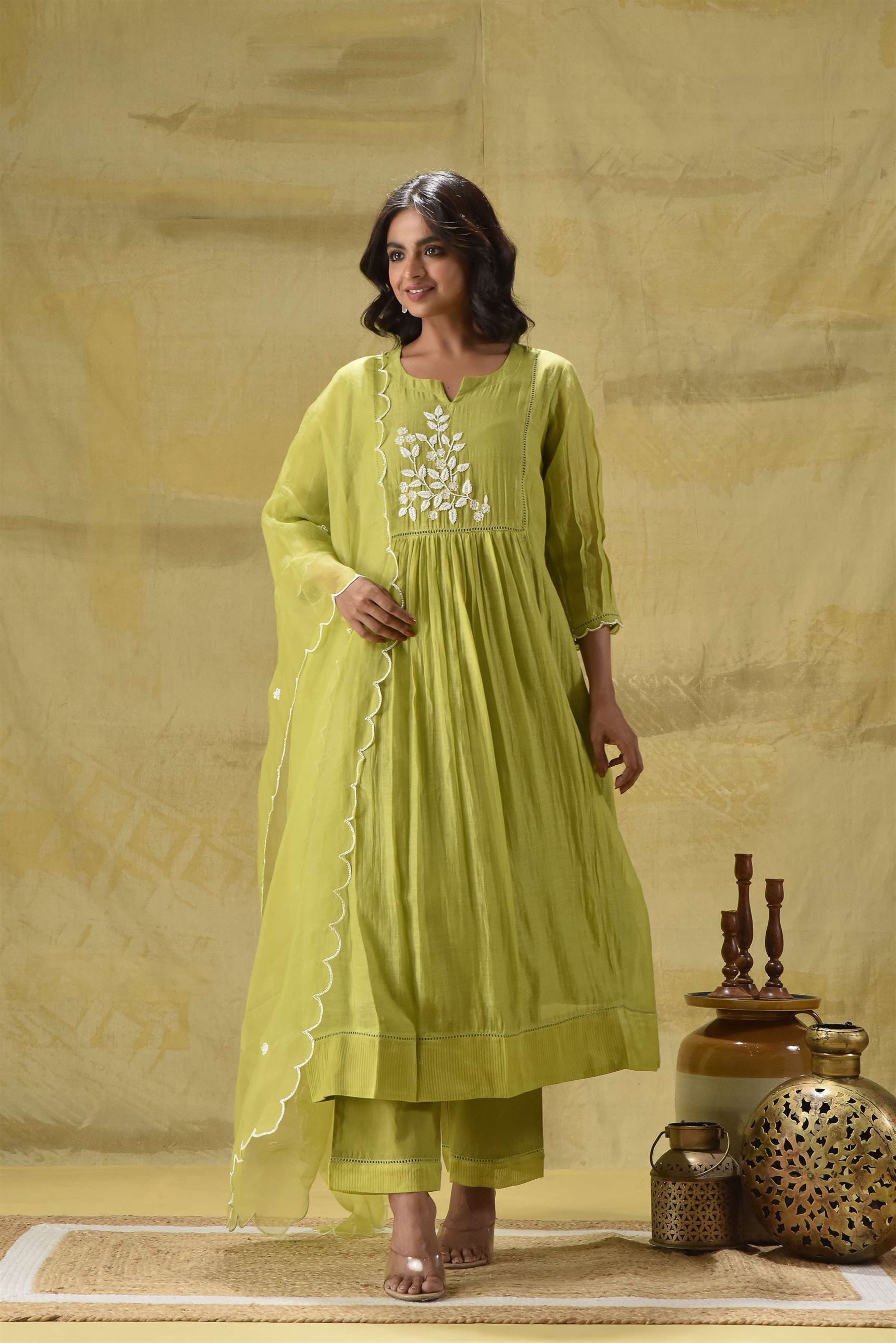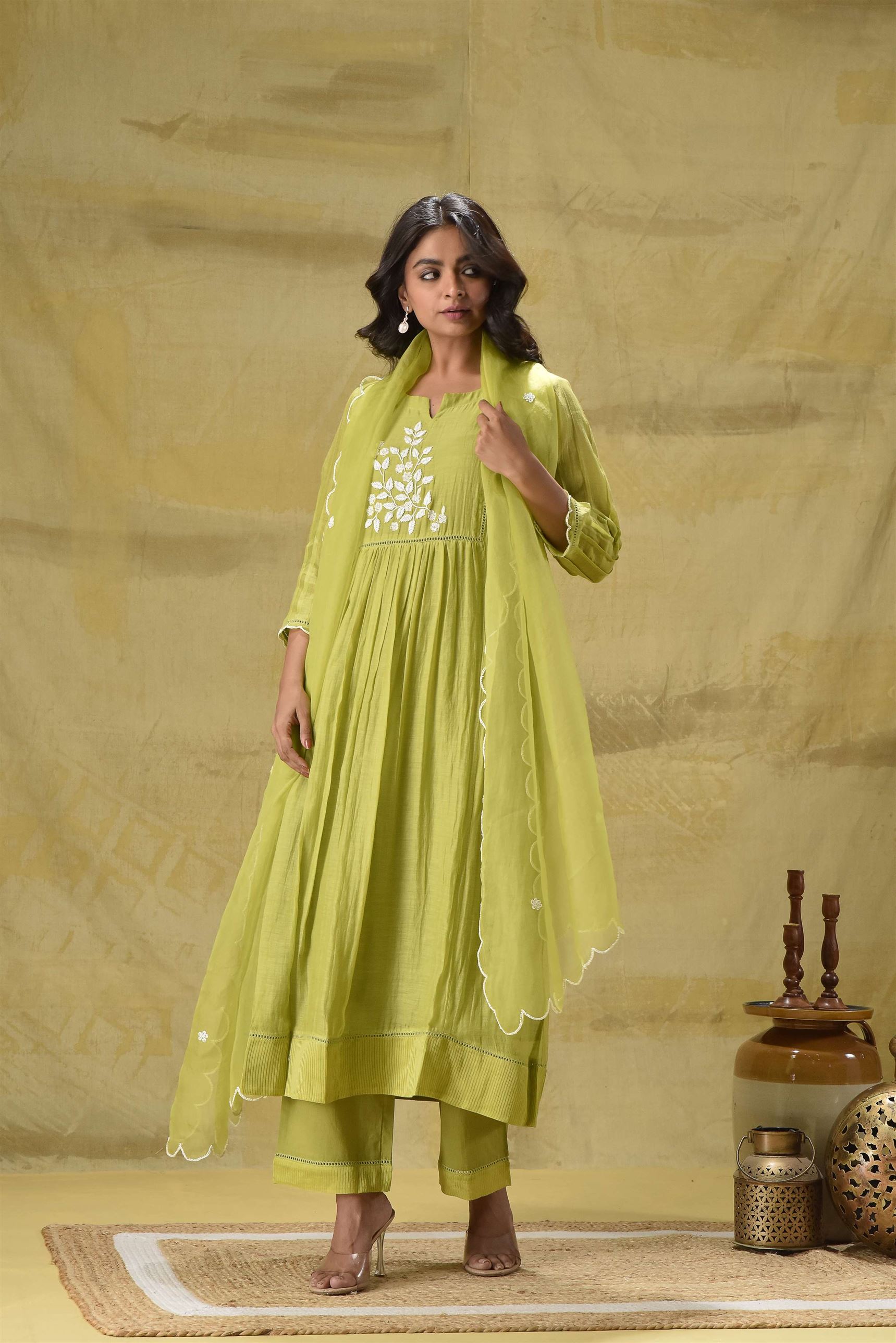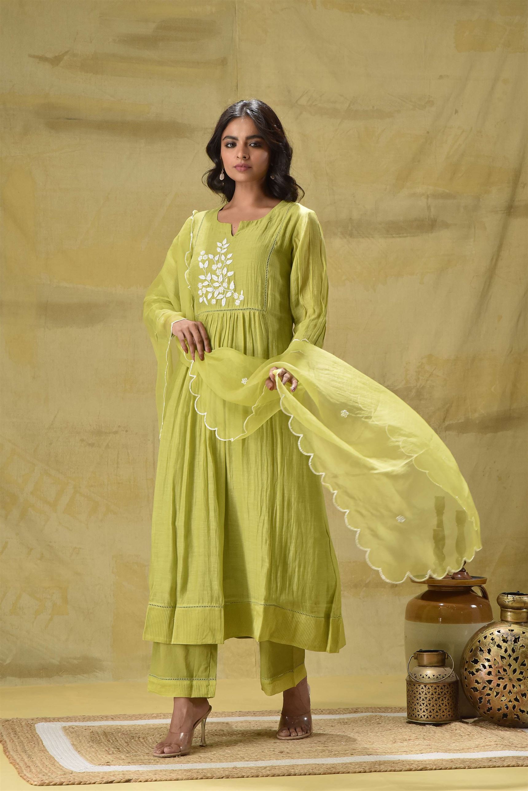 Lime Green sequence and cut dana embroidered Suit Set . The pure organza dupatta is also adorned with delicate handwork. The set comes with a cotton pair of pants