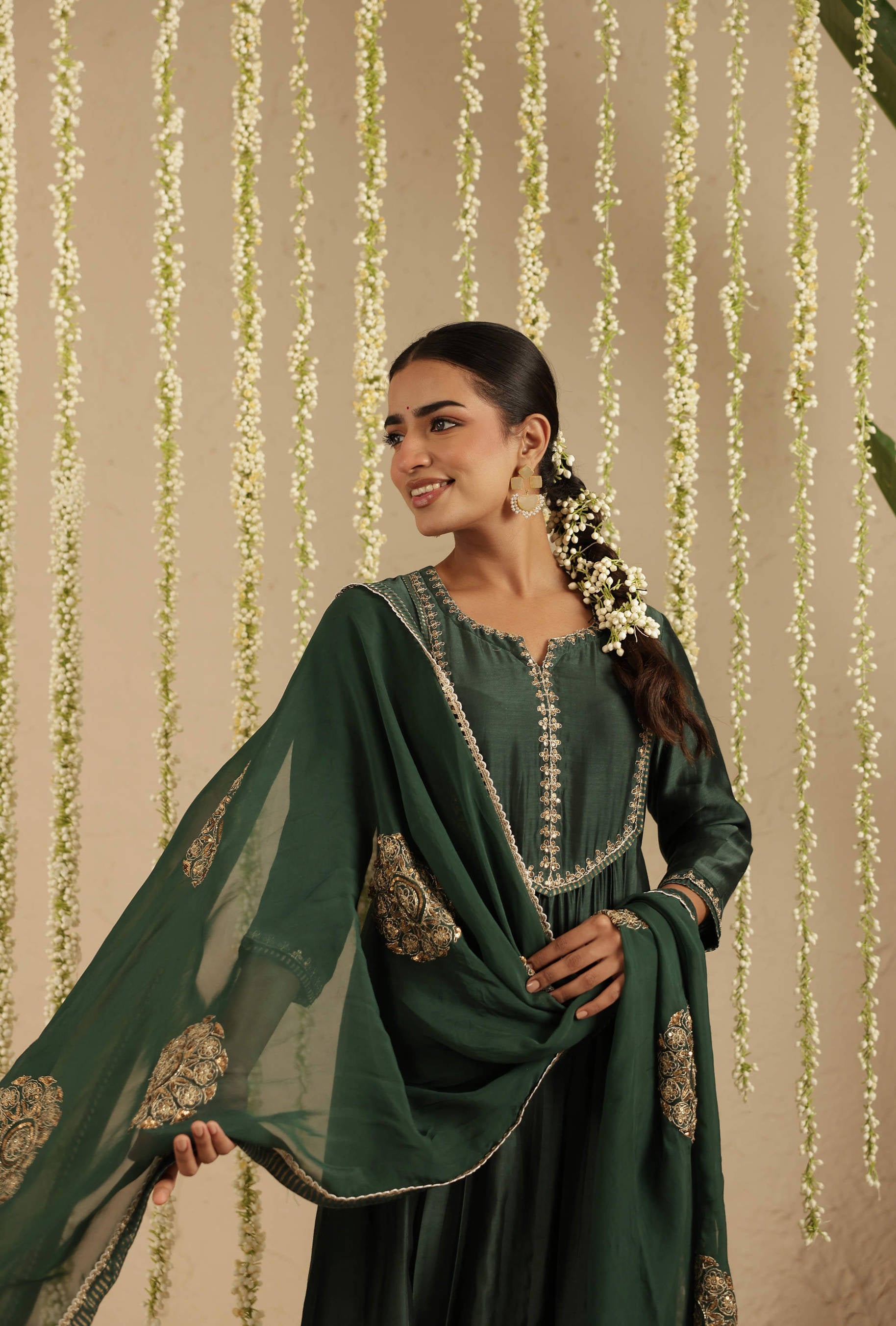 The organza dupatta with beautiful hand embroidered motifs on it is the USP of this 3 piece set. The set is made in Handloom Chanderi and has sequence and dori Hand Embroidery on the yoke and dupatta. The tissue detailing on the dupatta and Pants gives it an exquisite look.