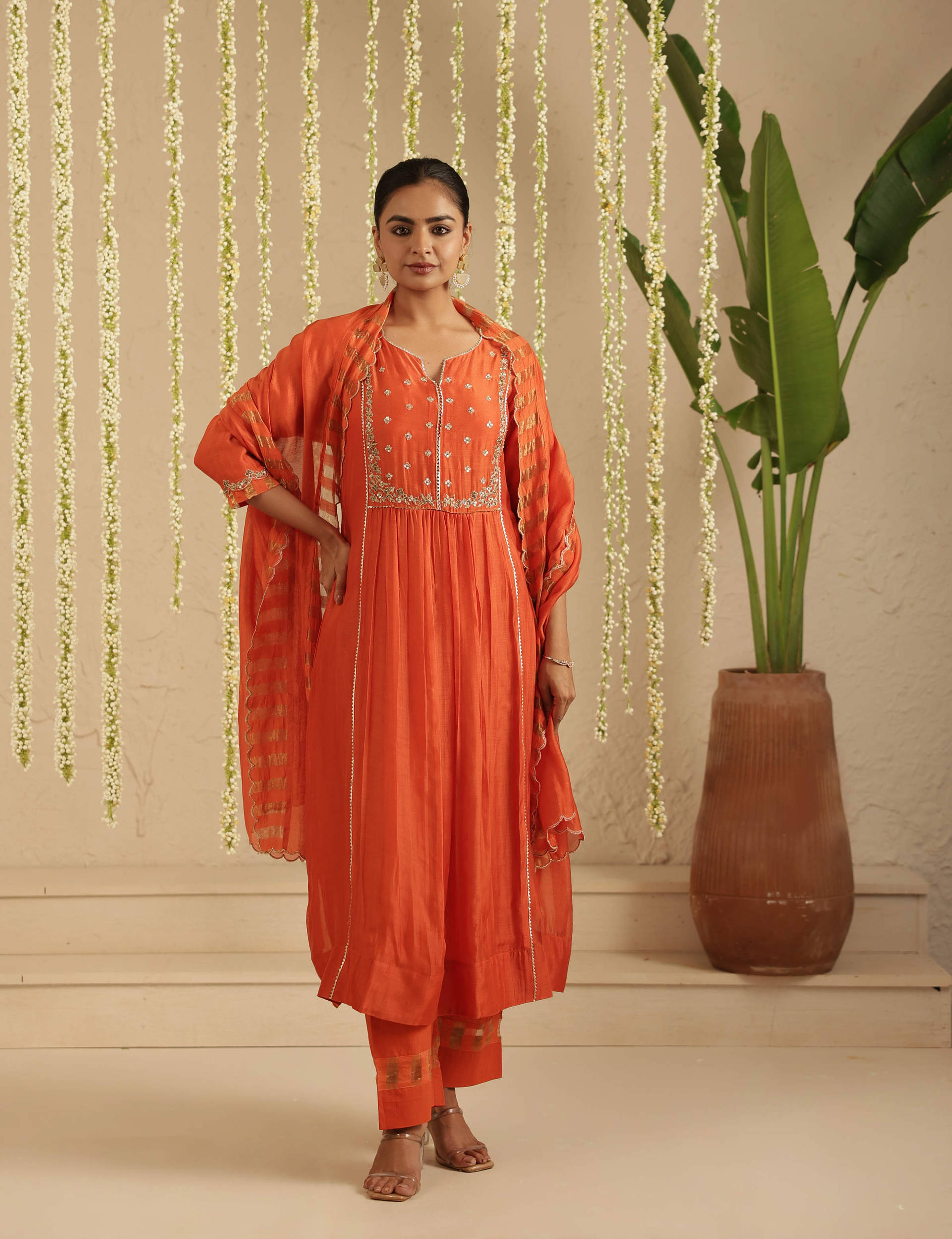 The 3 piece set made in Handloom Chanderi has exquisite hand embroidery on the front Yoke and sleeves. The set comes with a cotton Pant and a handloom Chanderi Dupatta with Tissue scalping