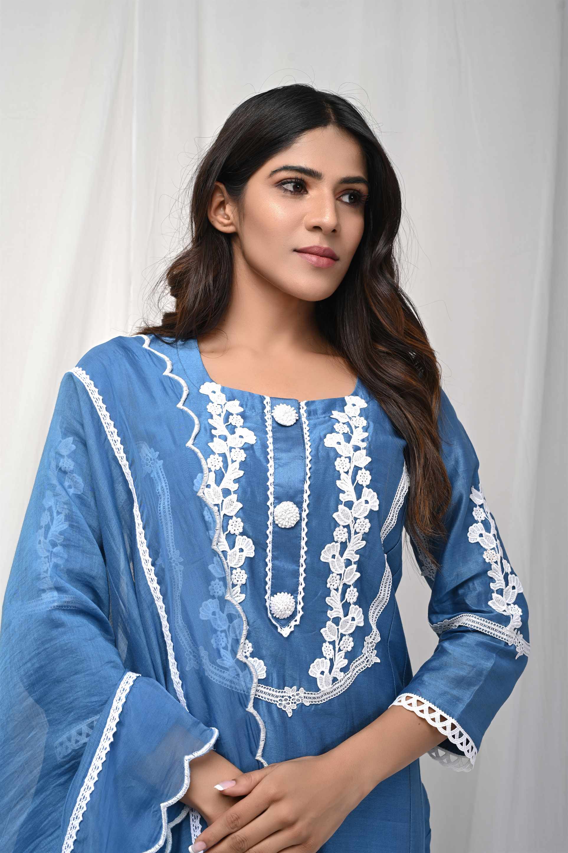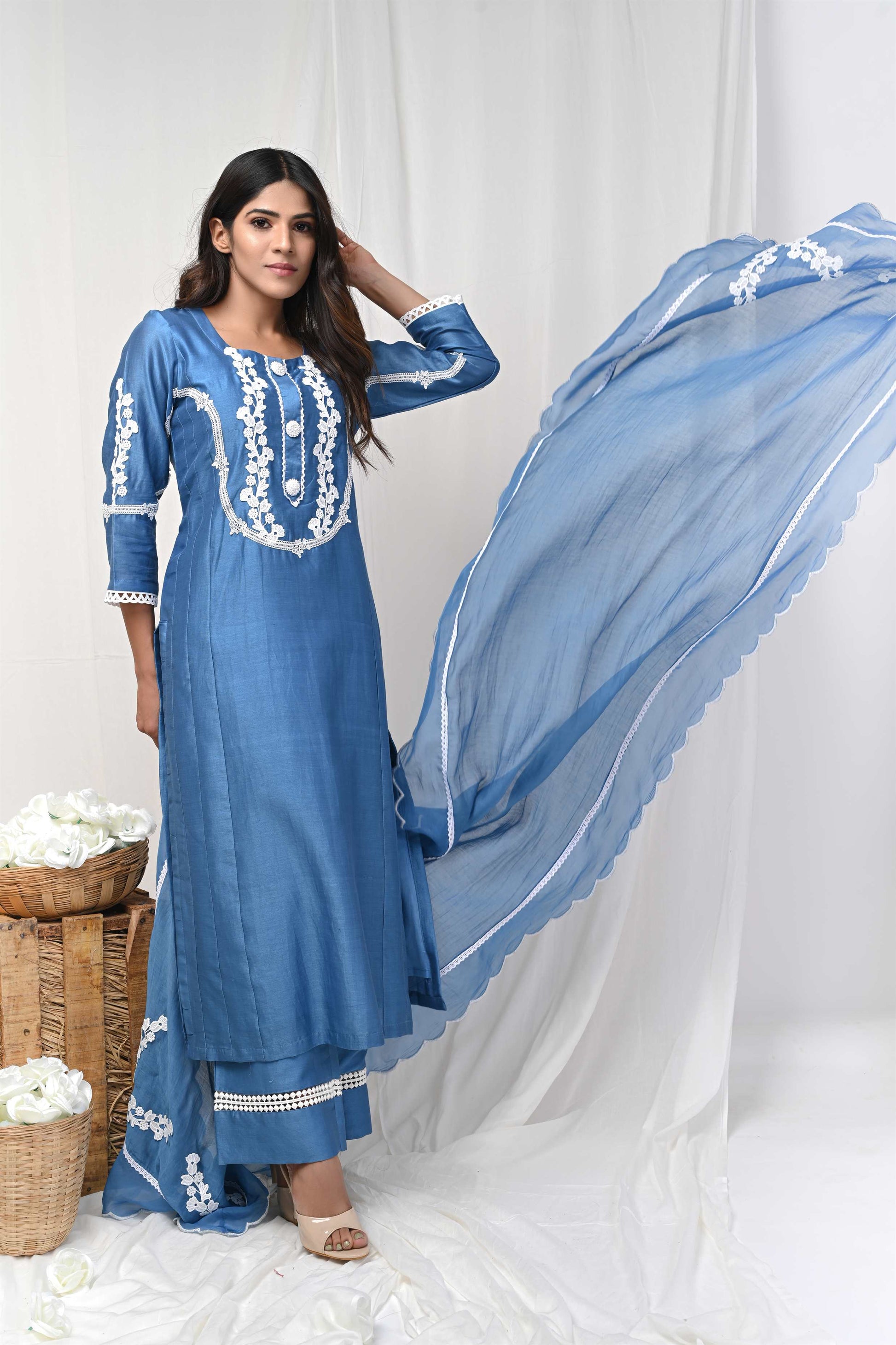 A Blue Straight Kurta in fine chanderi silk with lace and embroidery. It is paired with matching pants and a dupatta.