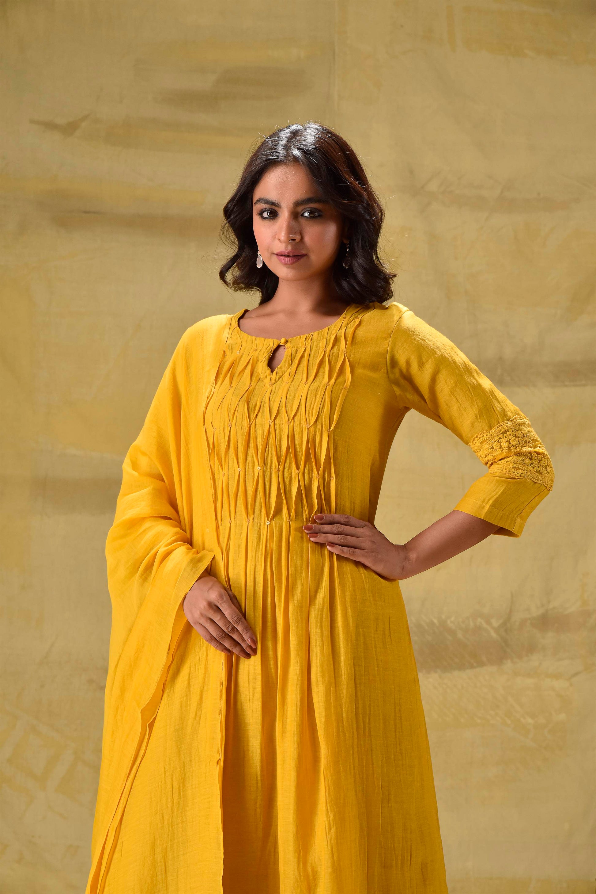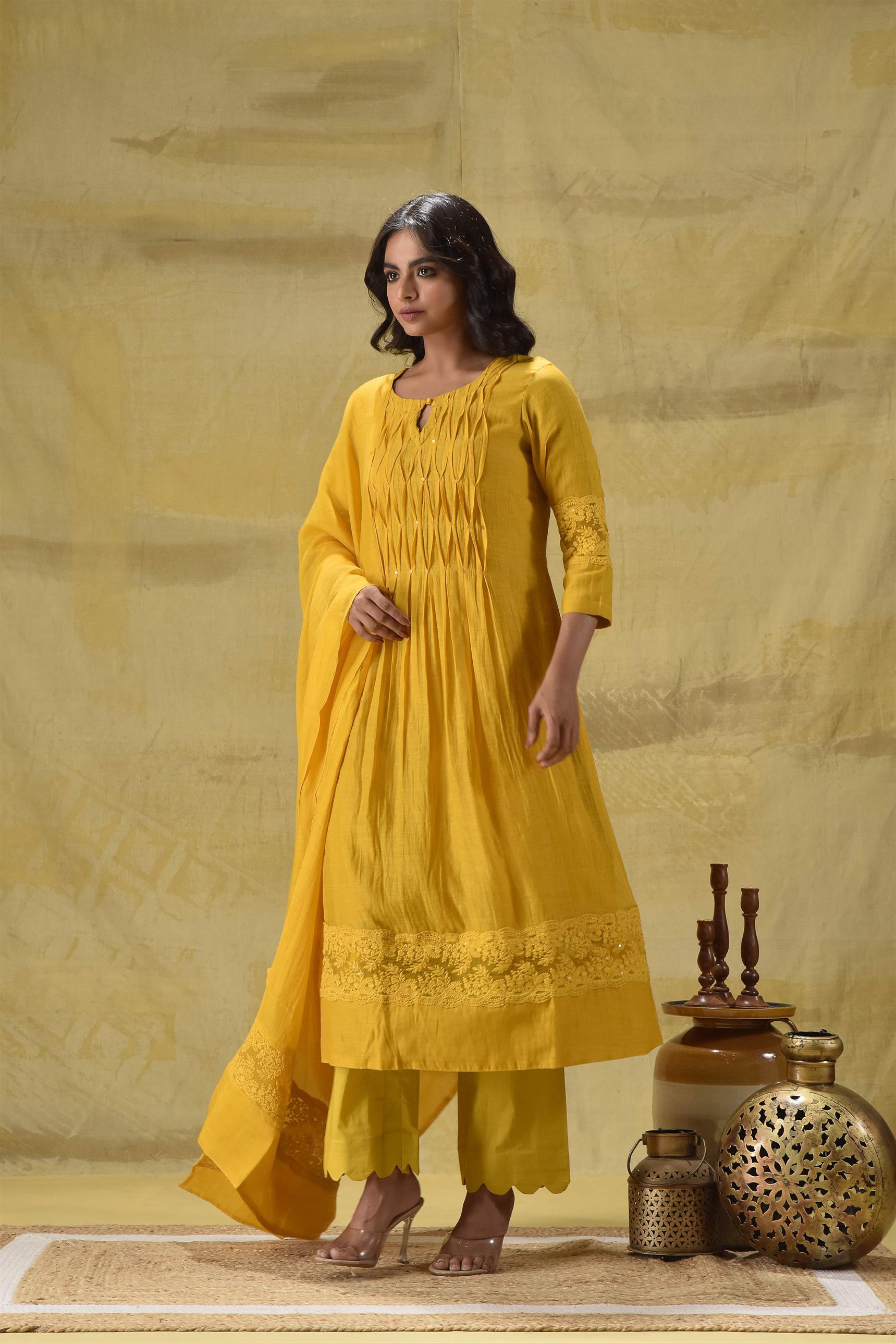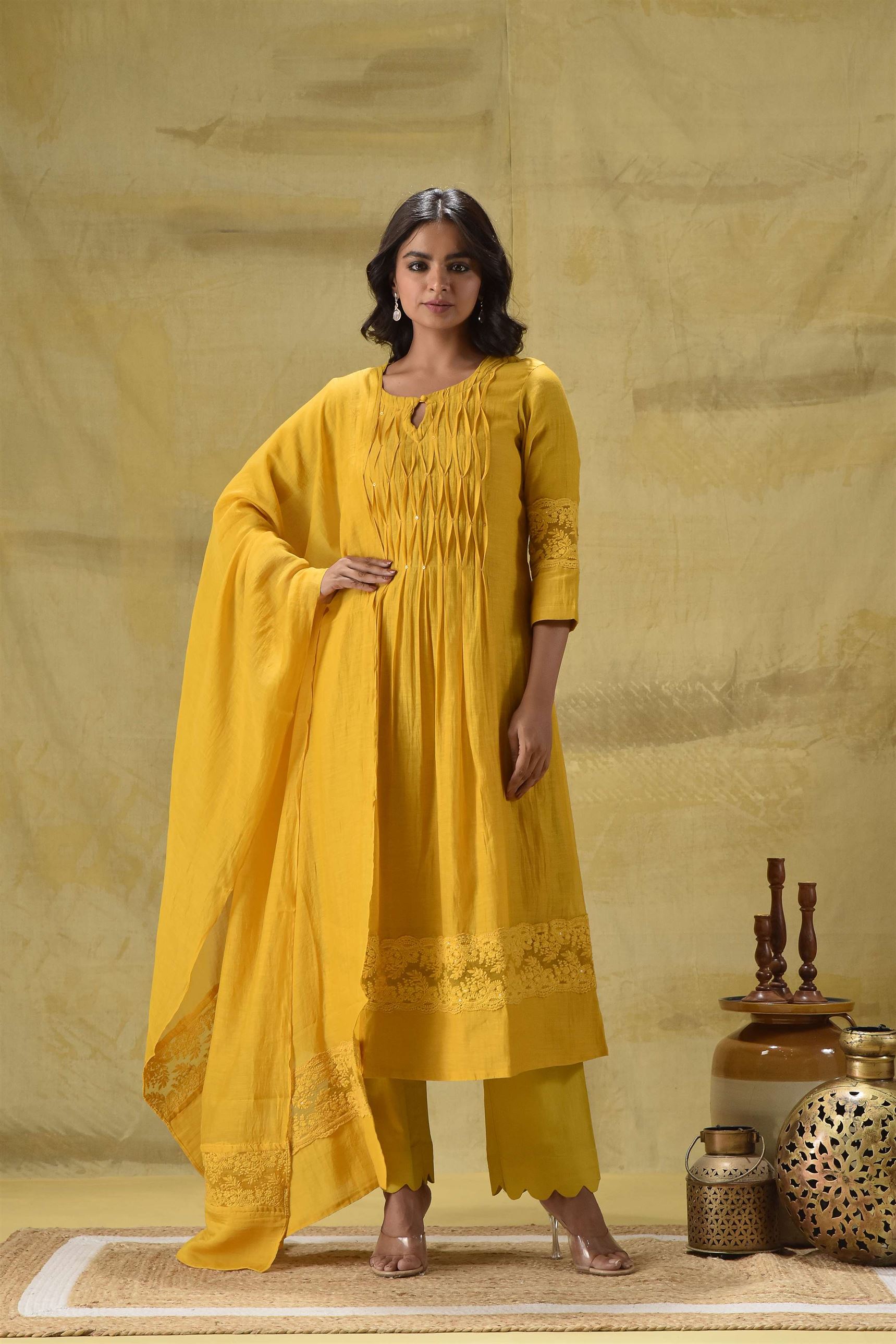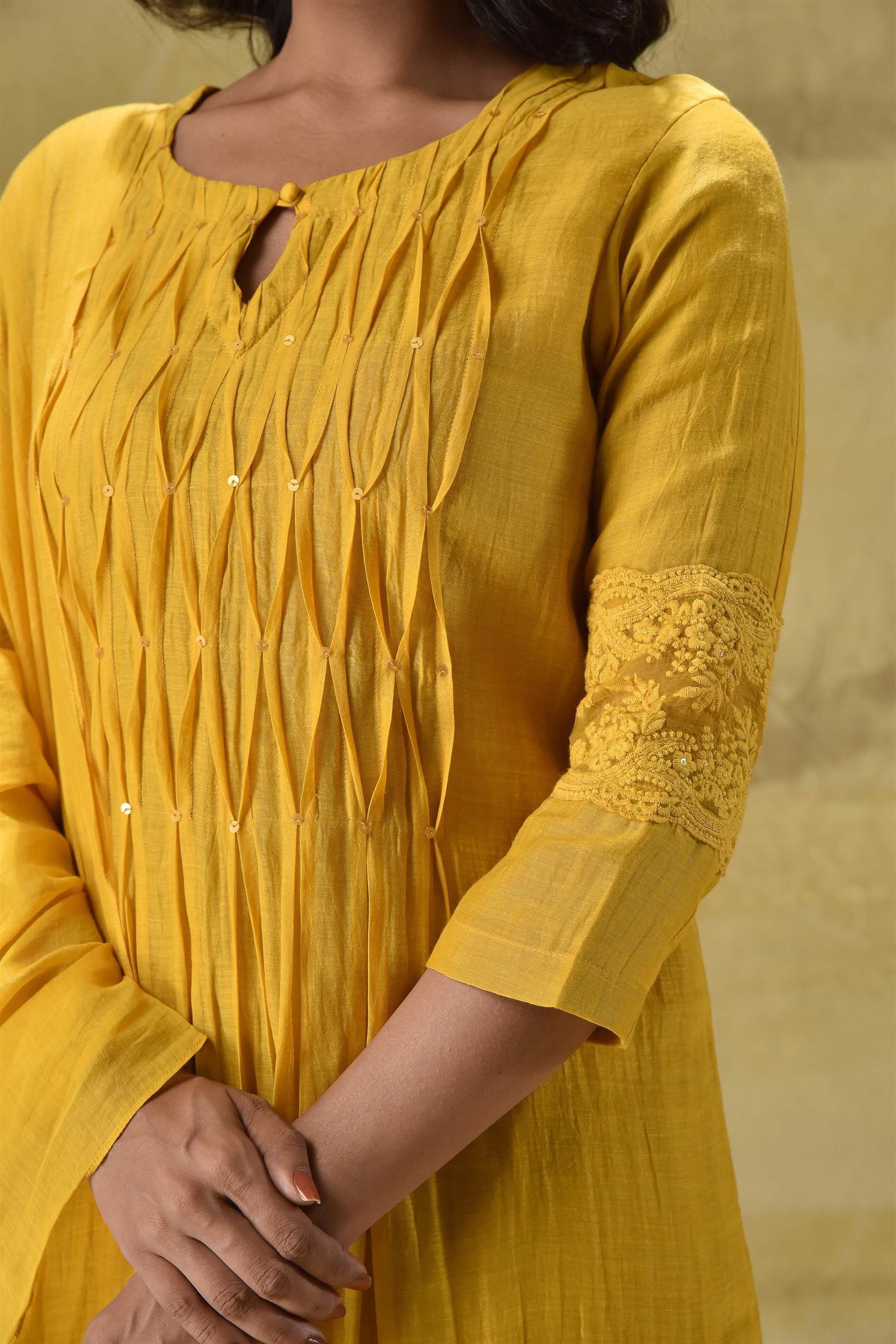 When you want something simple yet classy, this piece is for you. Minimal plete detailing and chifley embroidery on the hem of the kurta and the dupatta with cotton pants. All in a deep gold colour.