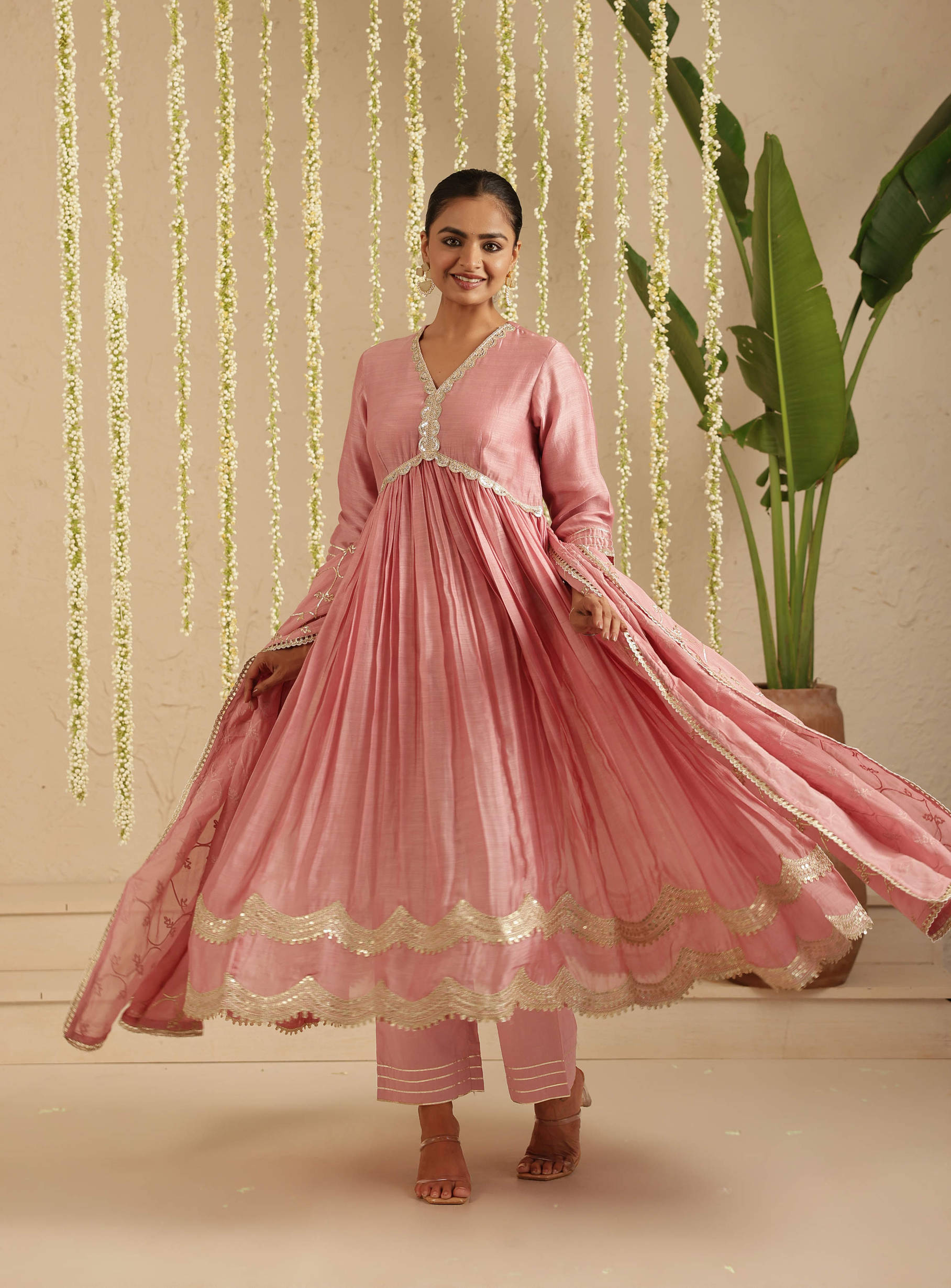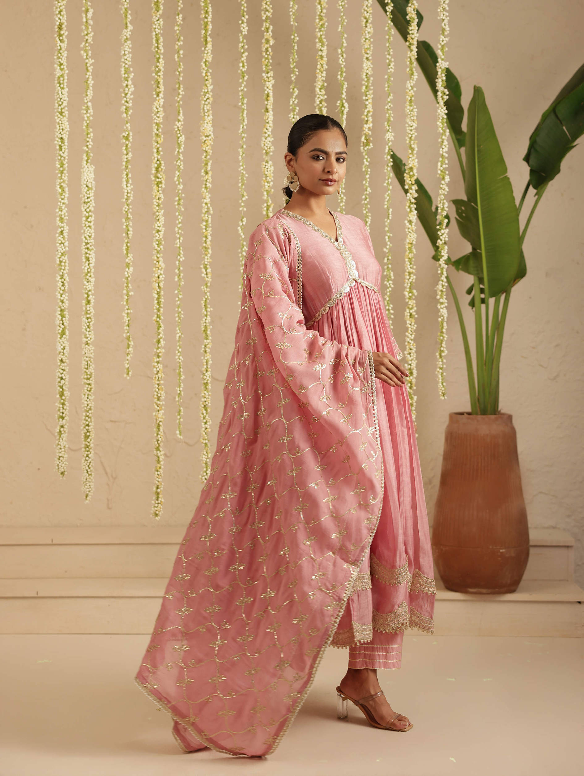 We have a soft corner for heavy dupattas and subdued colours. This set has both !! The anarkali is in Handloom Chanderi with cotton pants. The dupatta in chiffon is heavily embroidered.