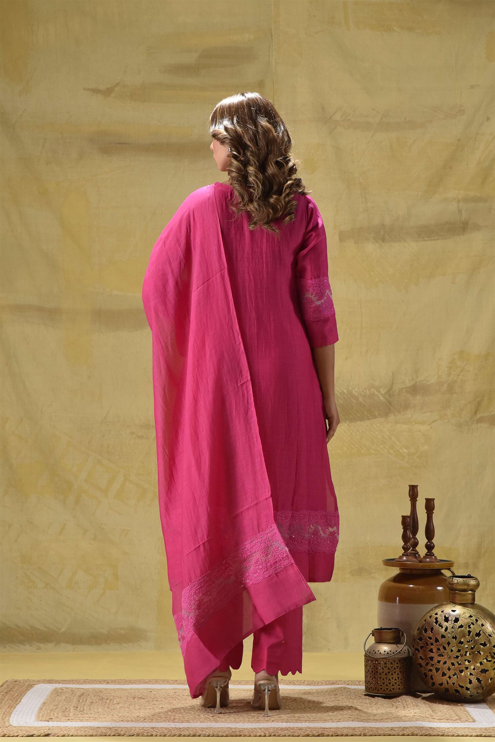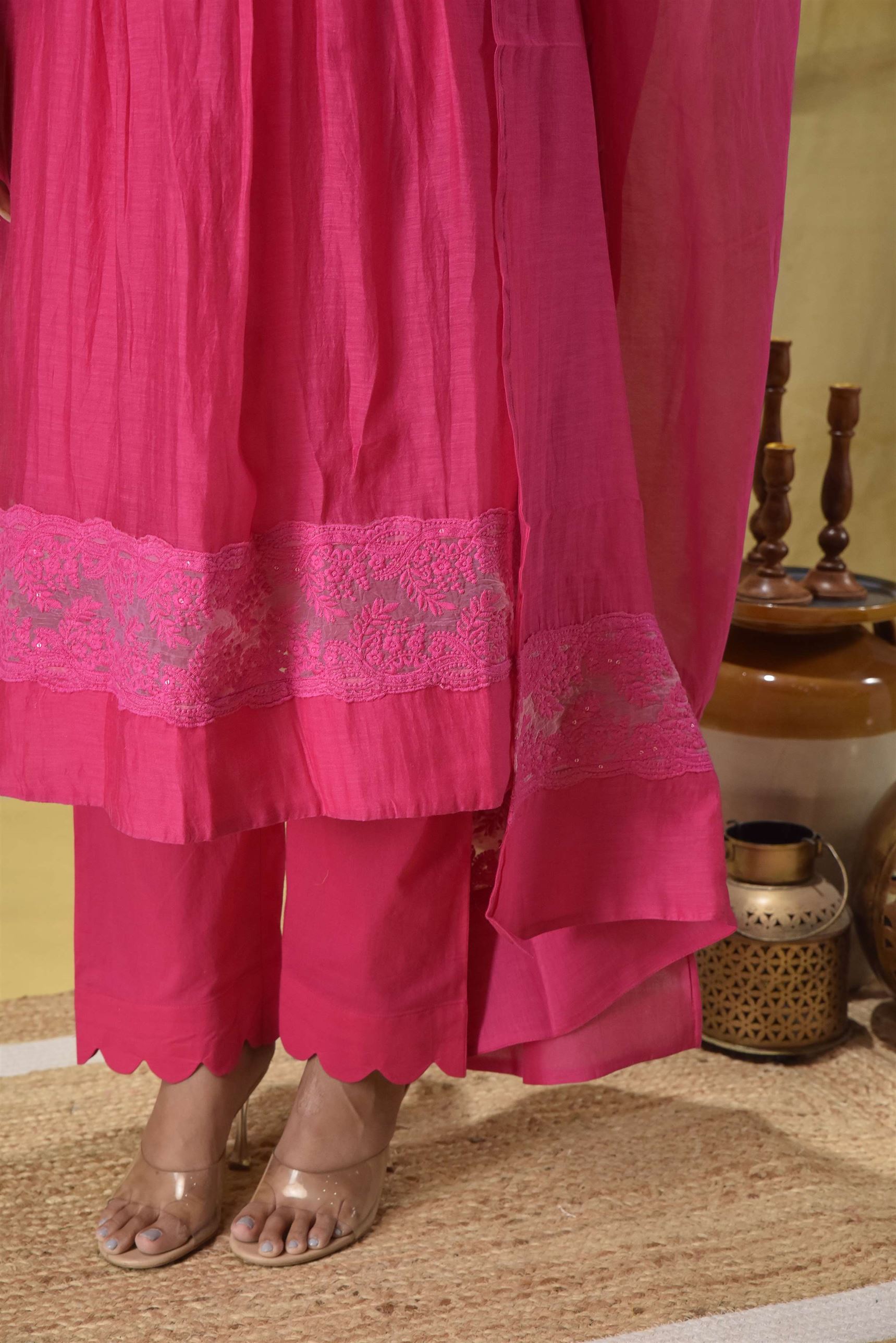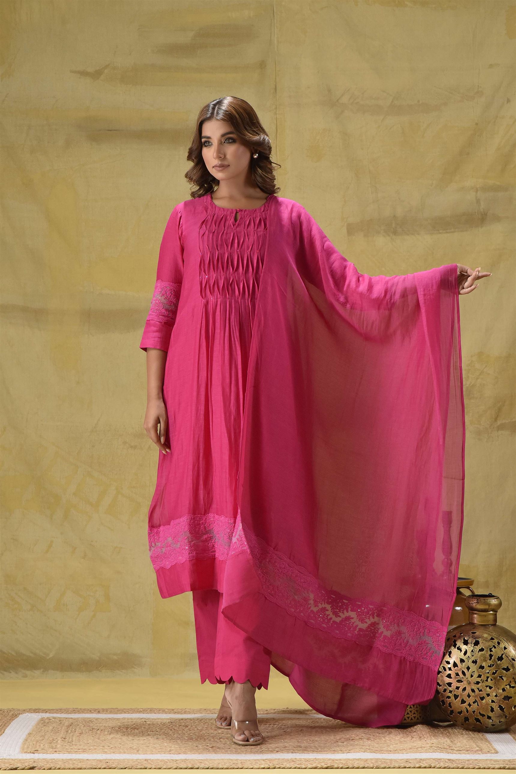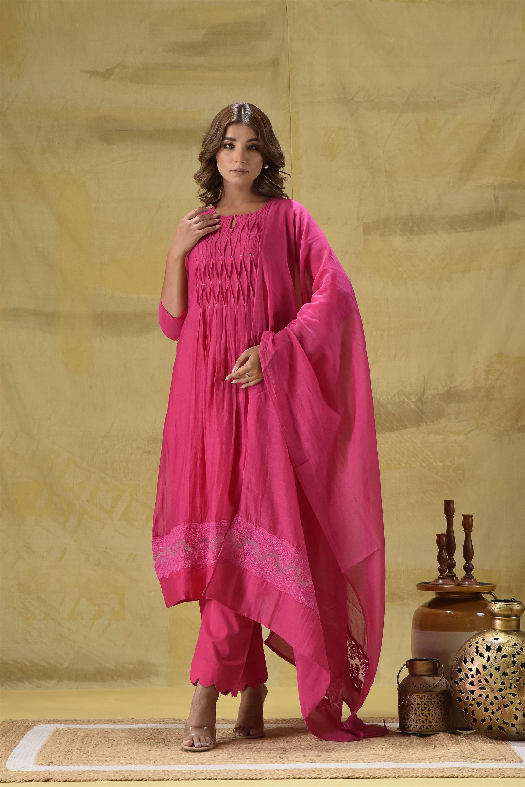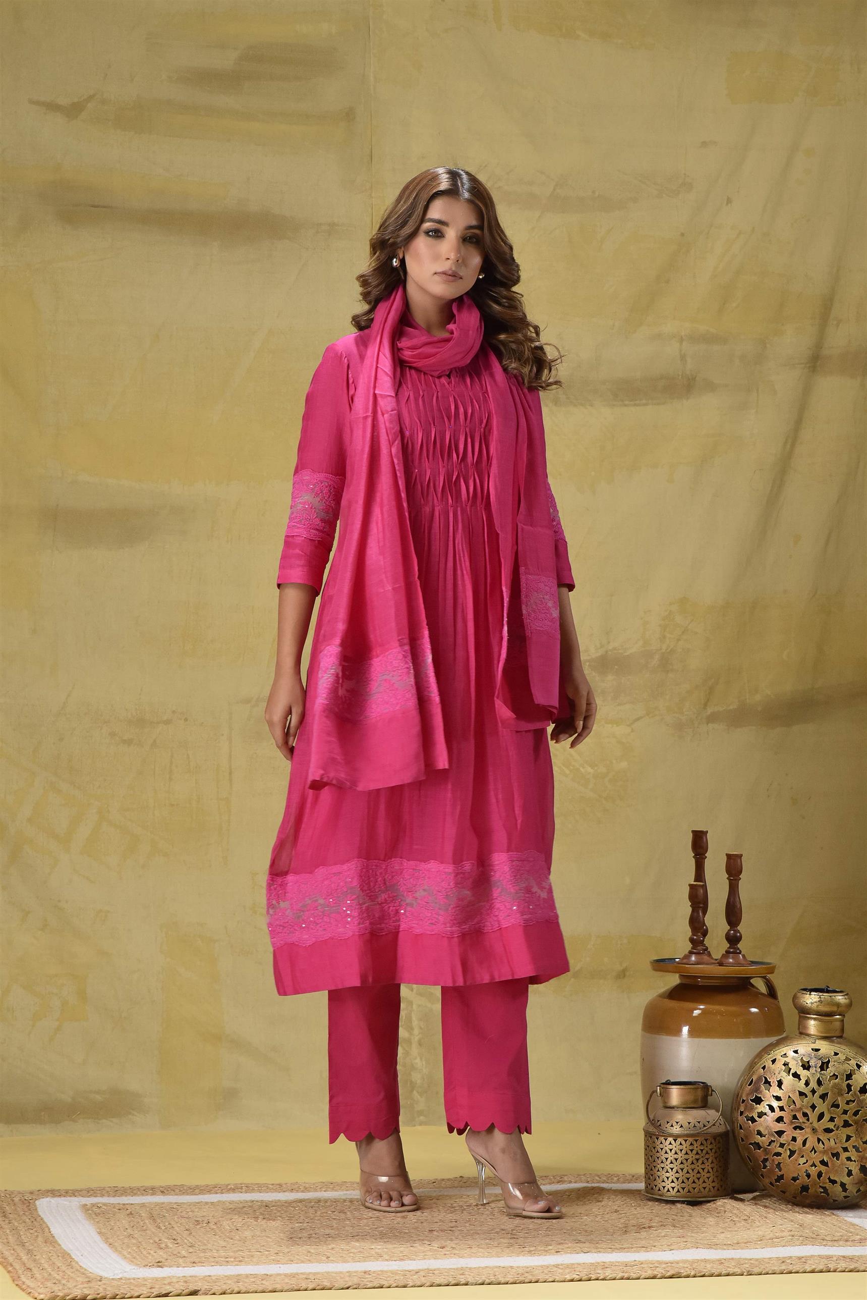When you want something simple yet classy, this piece is for you. Minimal plete detailing and chifley embroidery on the hem of the kurta and the dupatta with cotton pants. All in a bright hot pink colour.