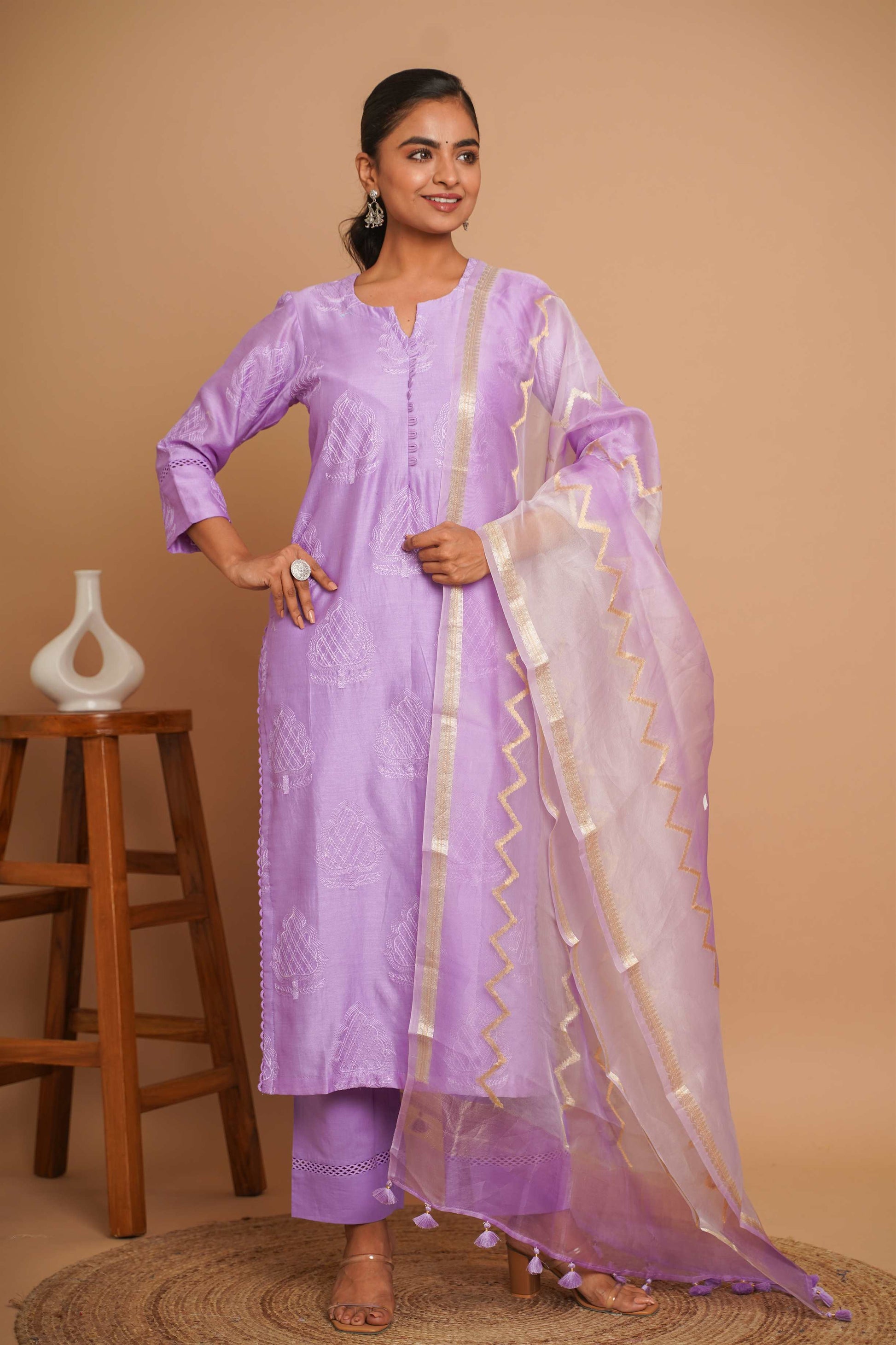 A chanderi silk embroidred suit set with organza silk dupatta and cotton pair of pants.