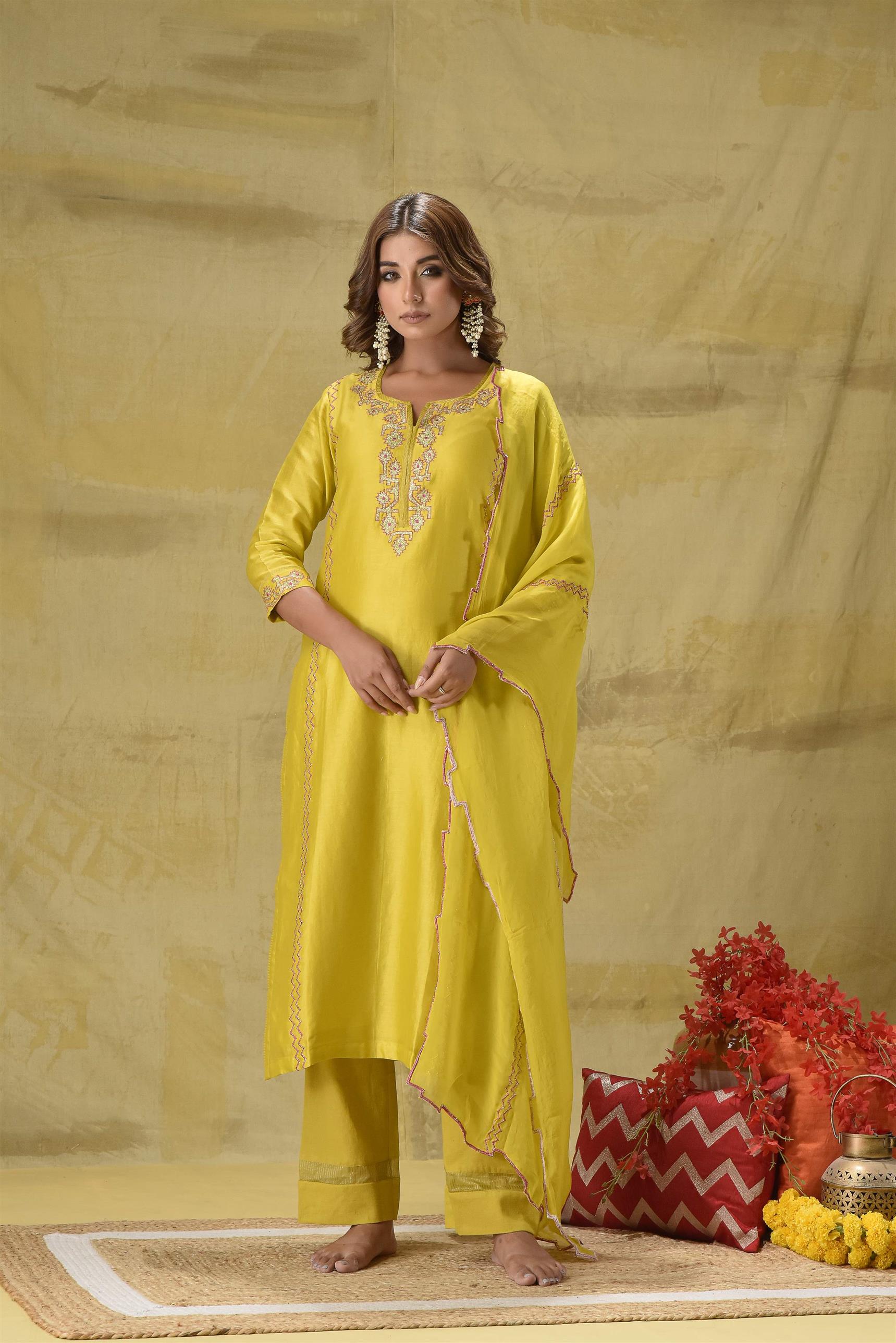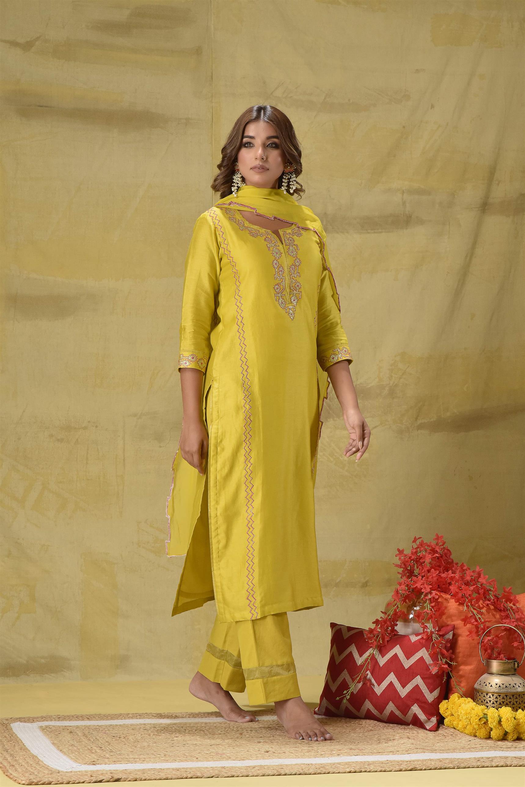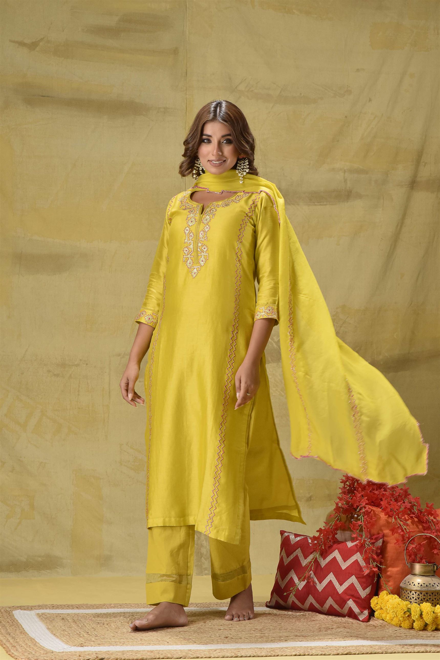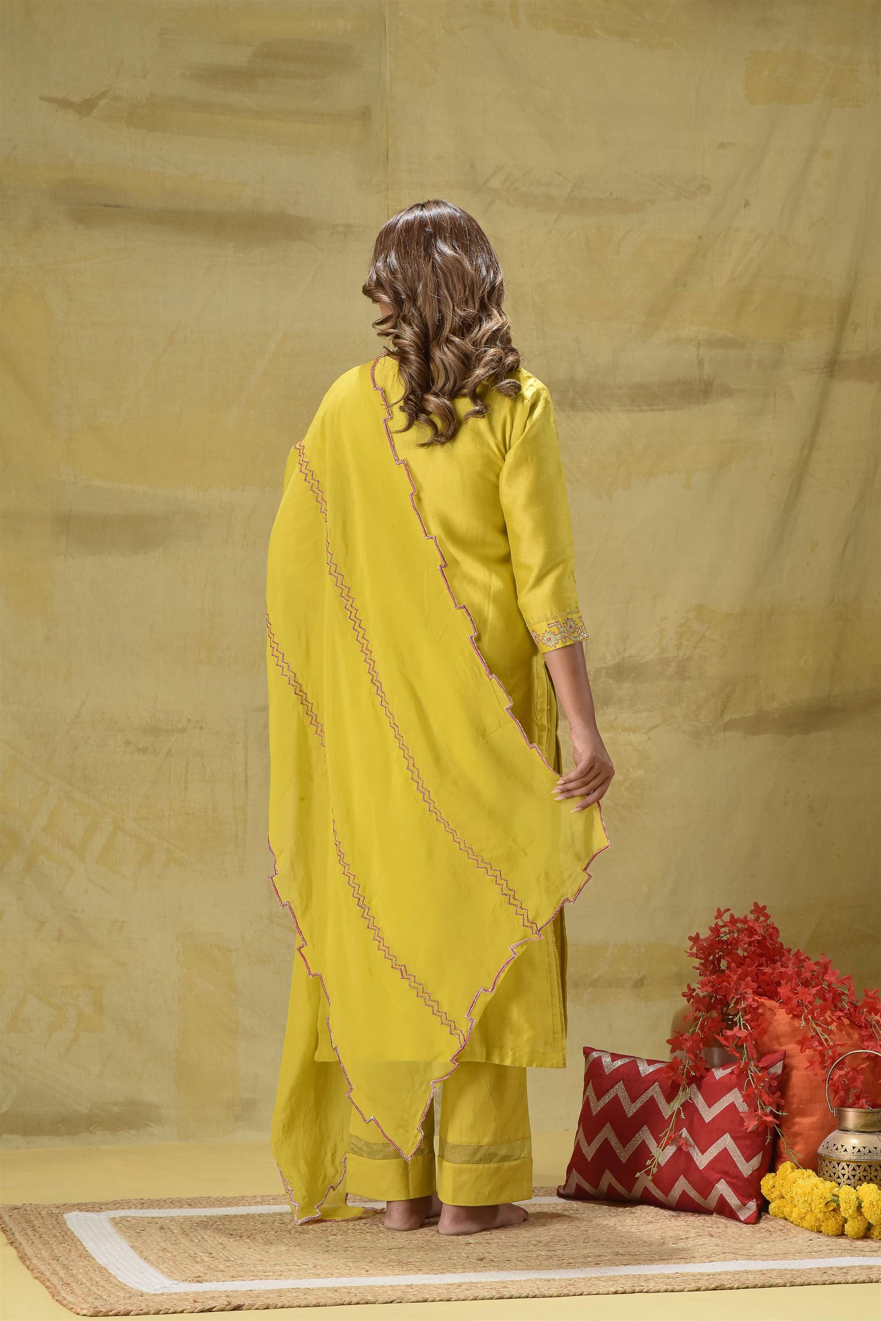 The Lime Yellow Suit set is made in Handwoven chanderi Silk. It is embroidered with thread and badla on the front of the kurta and the dupatta. The set comes with a cotton pair of pants.