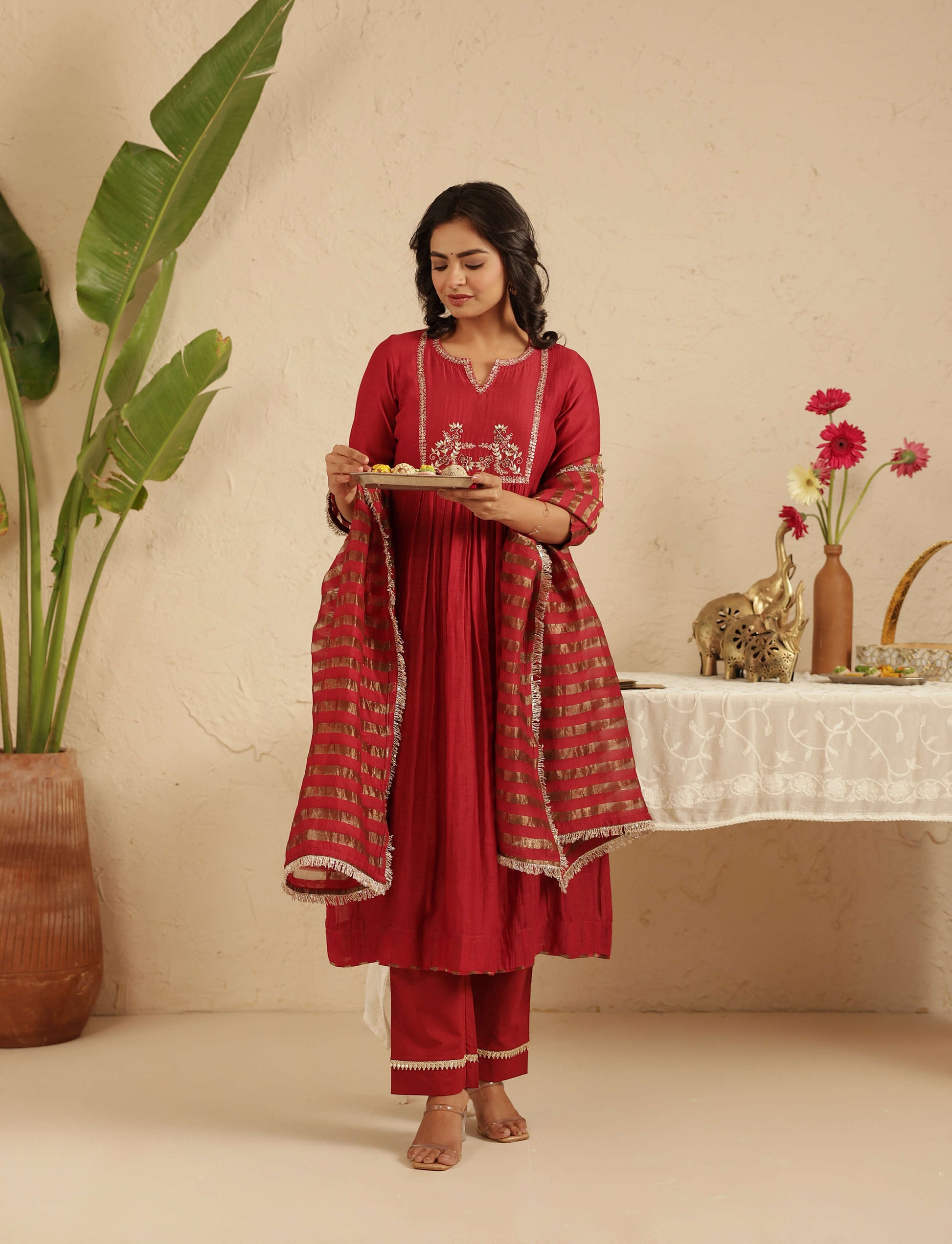 Maroon Hand Embroidered Suit with Tissue Striped Dupatta
