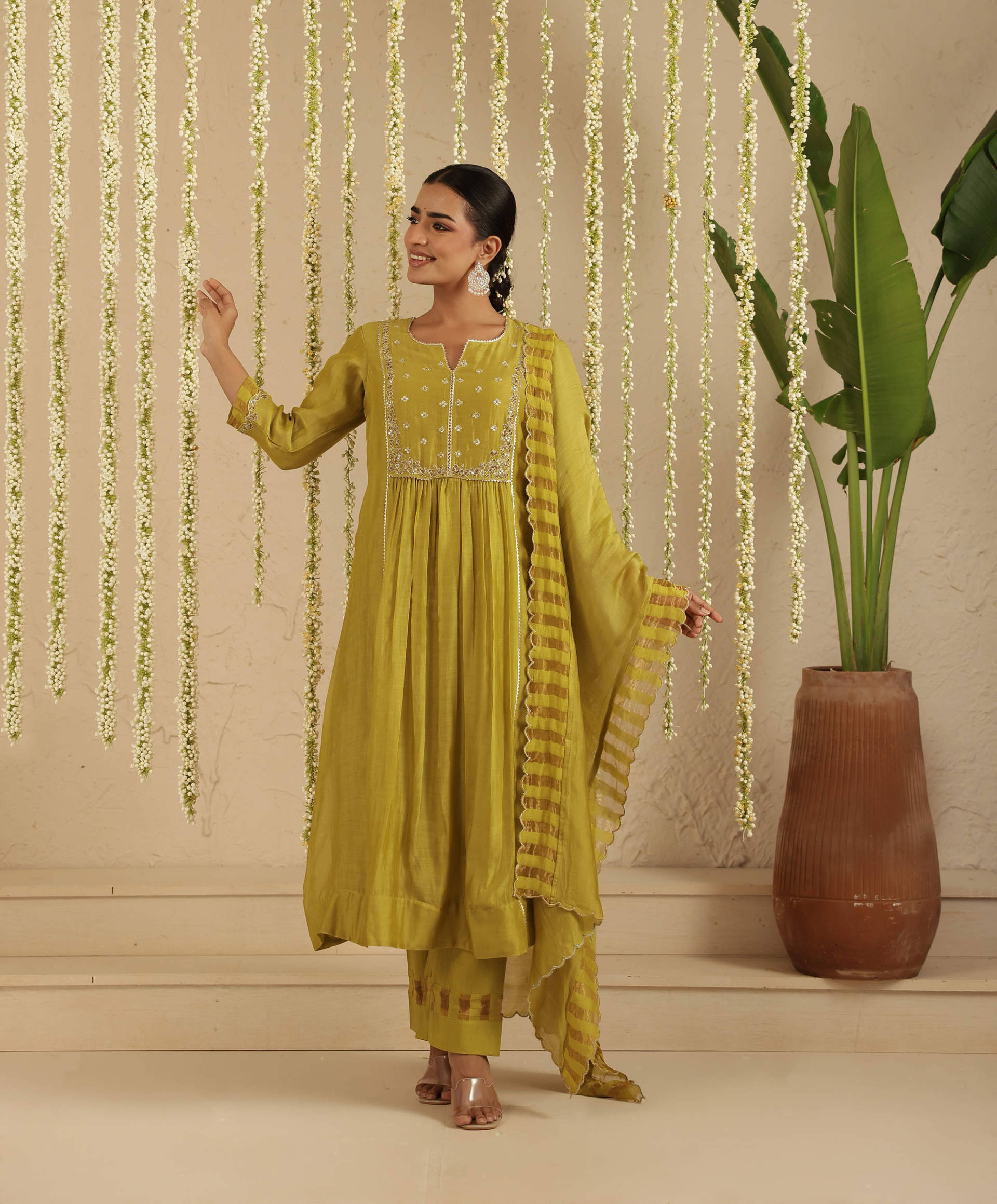 The 3 piece set made in Handloom Chanderi has exquisite hand embroidery on the front Yoke and sleeves. The set comes with a cotton Pant and a handloom Chanderi Dupatta with Tissue scalping