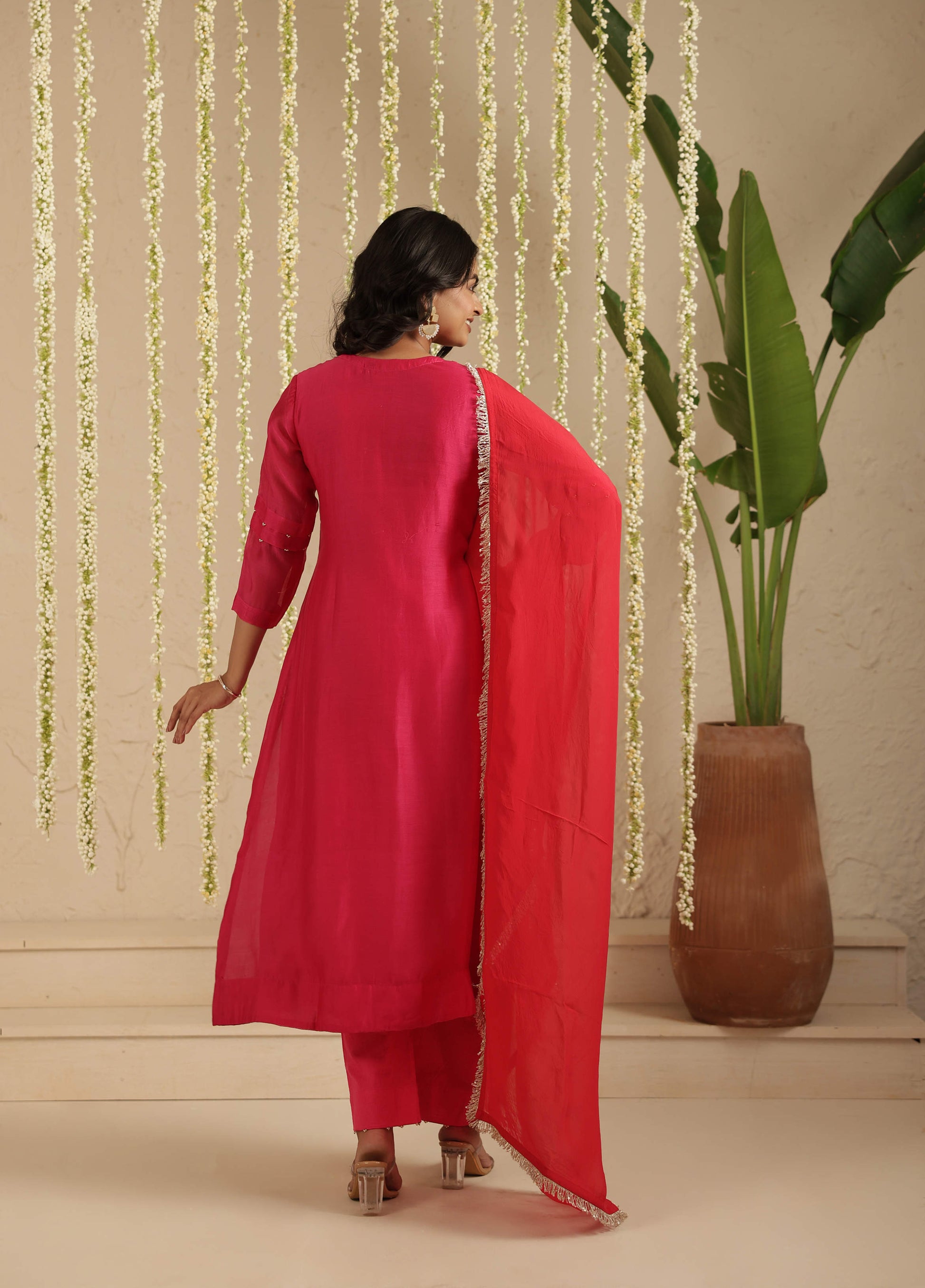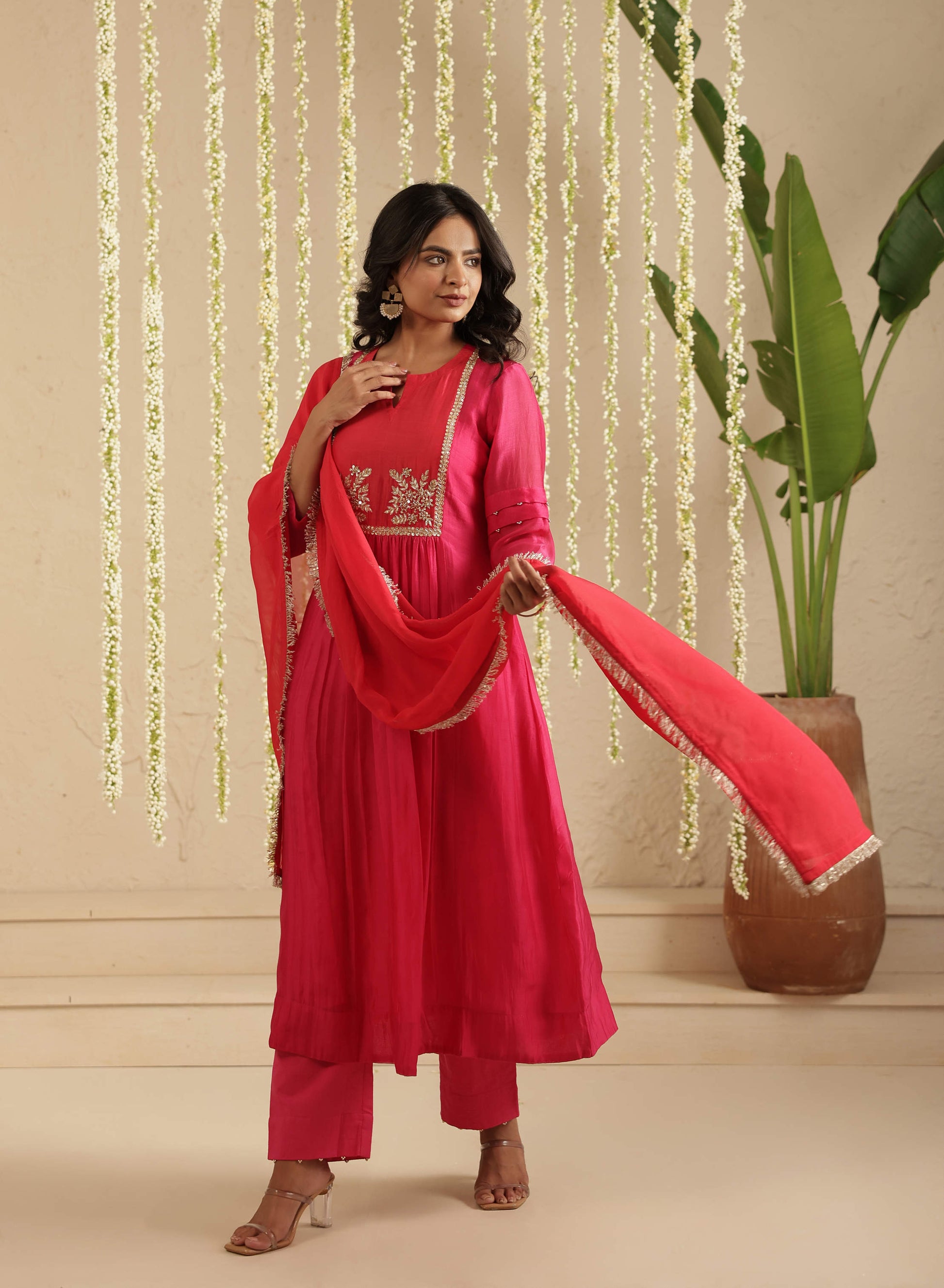 Shades of Red and Hotpink have always been the topsellers of every season because of their happy and vibrant vibe. This one is no different. The Hot Pink Suit with a Red Yoke embellished with hand embroidery gives it a super festive vibe.
