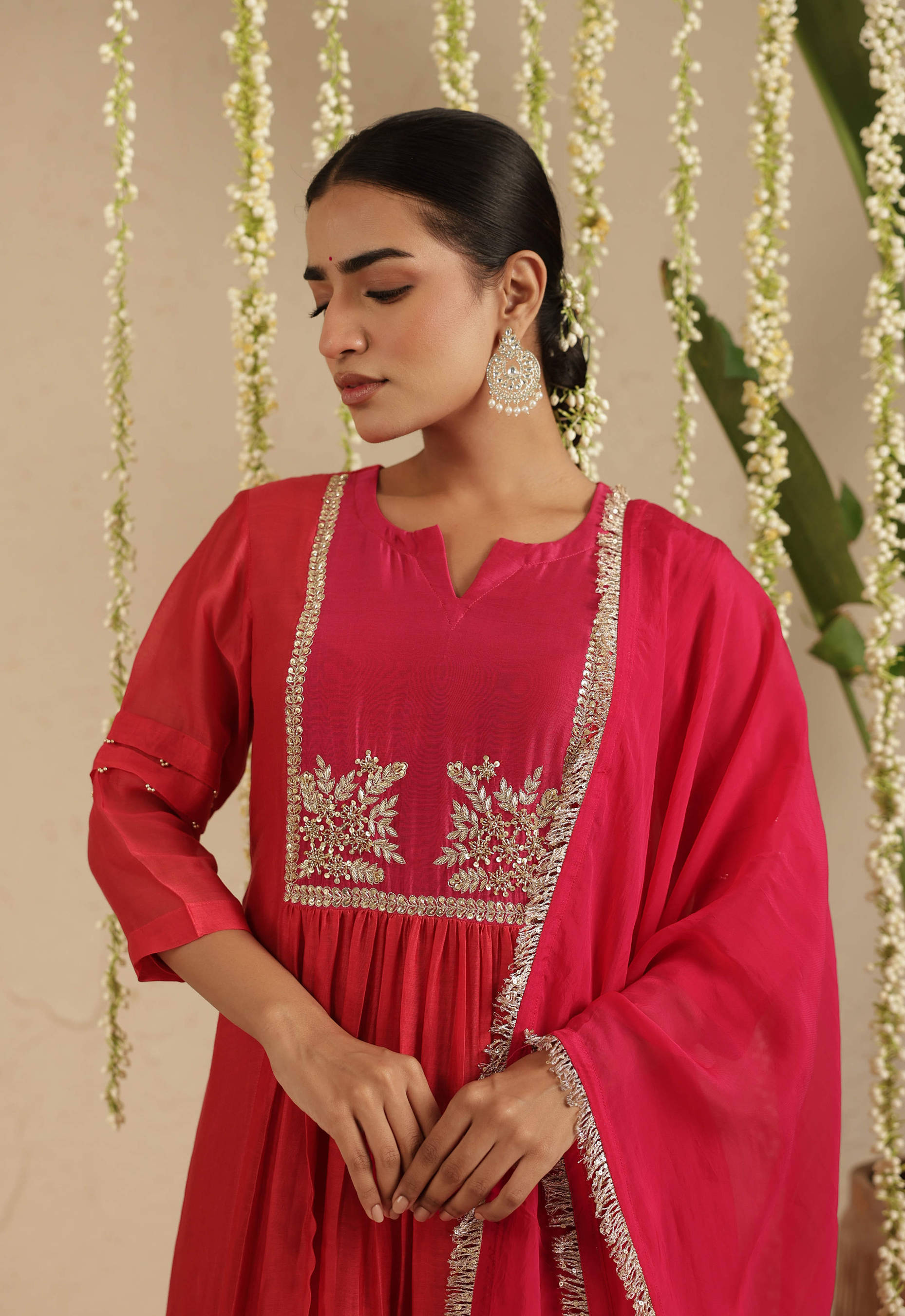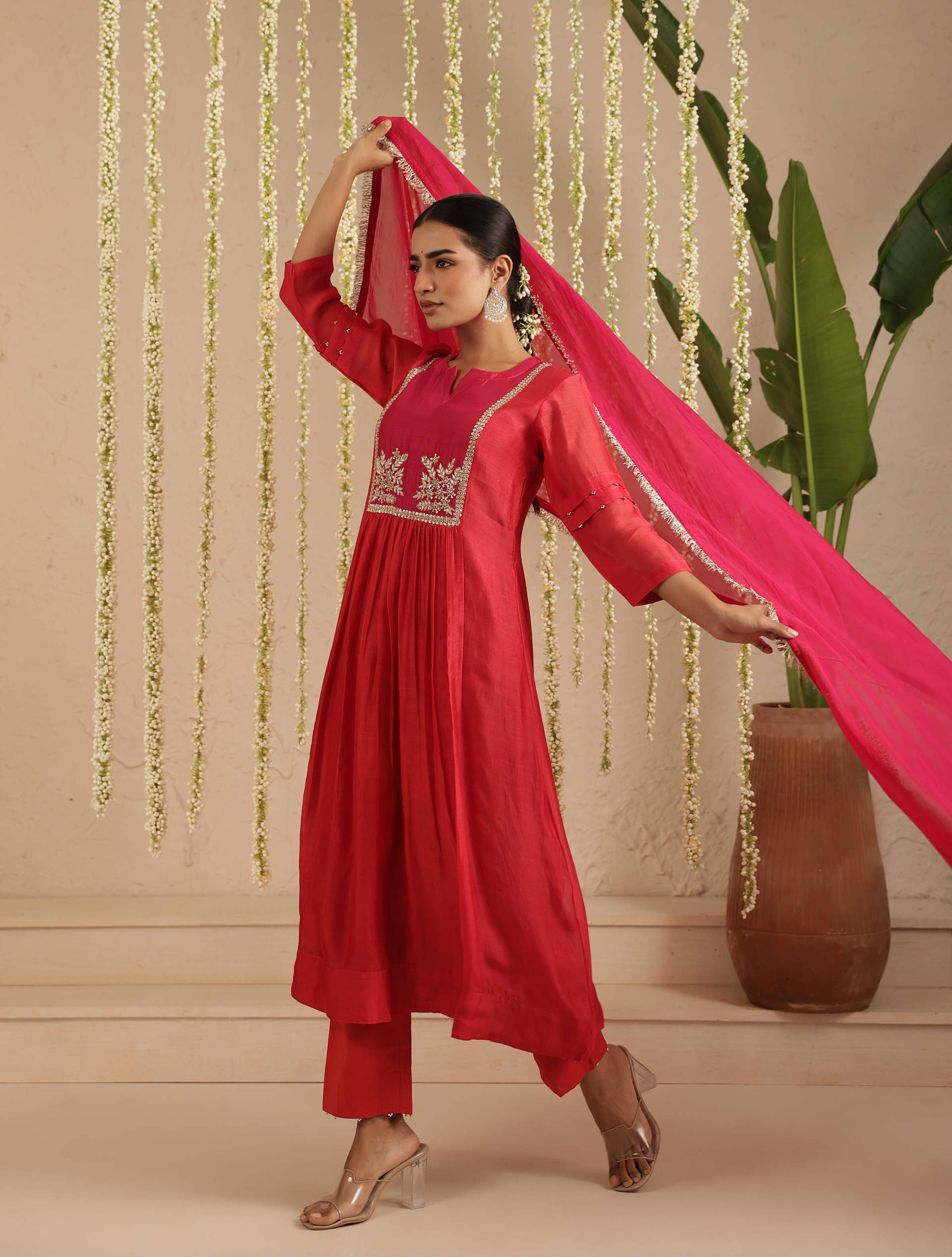 Shades of Red and Hotpink have always been the topsellers of every season because of their happy and vibrant vibe. This one is no different. The Red Suit with a Hot Pink Yoke embellished with hand embroidery gives it a super festive vibe.